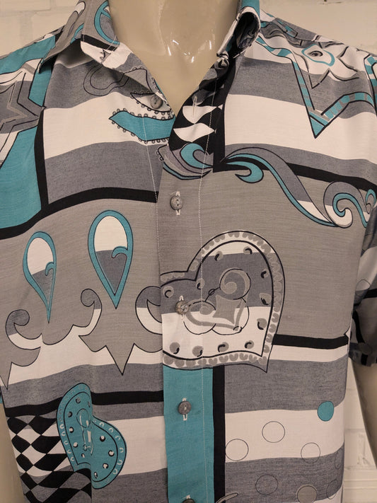 Vintage 80-90's HOM overhemd korte mouw. Groen Grijs Blauwe print. Maat XL.