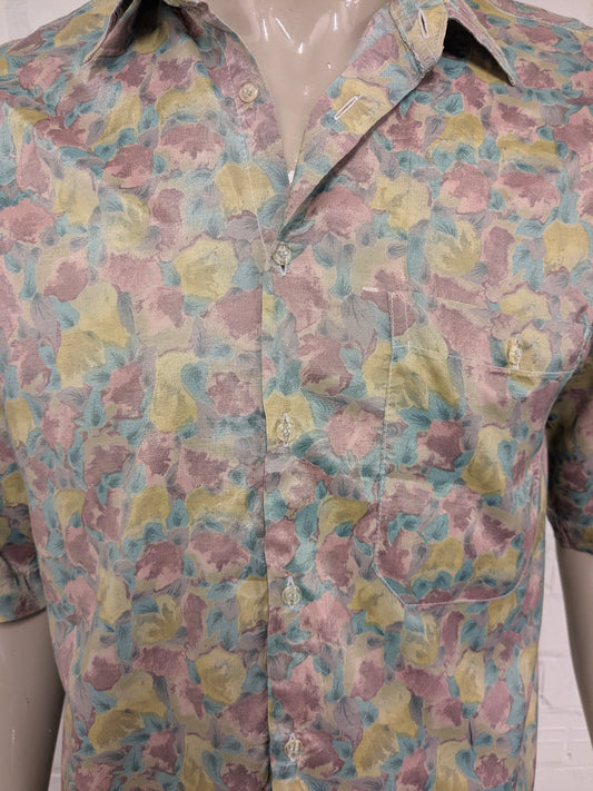 Vintage Bacardi Zijden overhemd korte mouw. Bruin Groen print. Maat L.