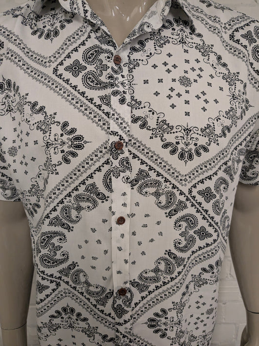 J.J.Dao shop overhemd korte mouw. Beige Zwarte print. Maat XL.