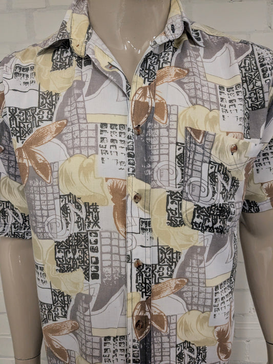 Vintage 80-90's shirts by Jac Tissot overhemd korte mouw. Bruin Zwart Gele print. Maat XL.
