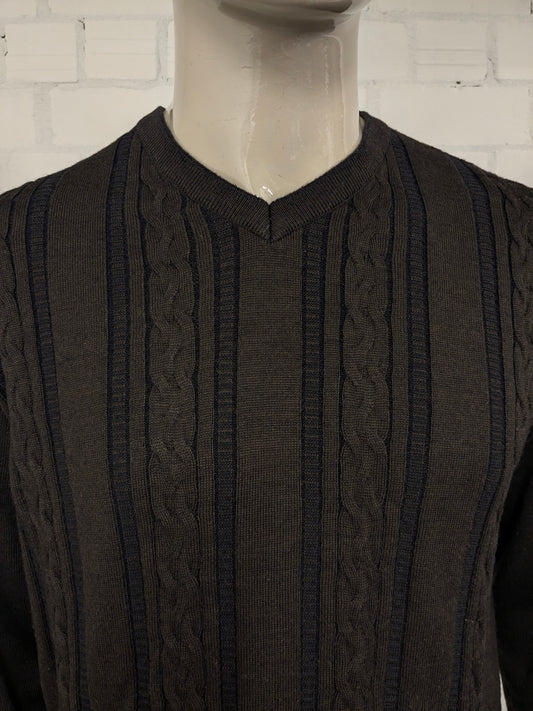 Bartlett & Walker Merino Wollen trui met V-Hals. Bruin Donker Blauw gekleurd. Maat L. 34% Wol.