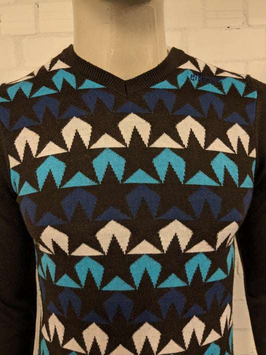 Energie Wollen trui met V-Hals. Bruin Blauw Wit motief. Maat S. 50% Wol.