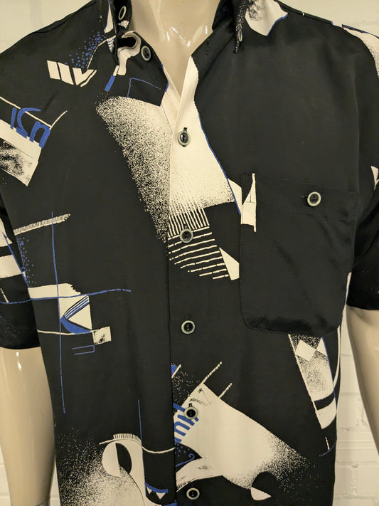 Vintage 80-90's Haupt overhemd korte mouw. Zwart Blauw Beige print. Maat L.