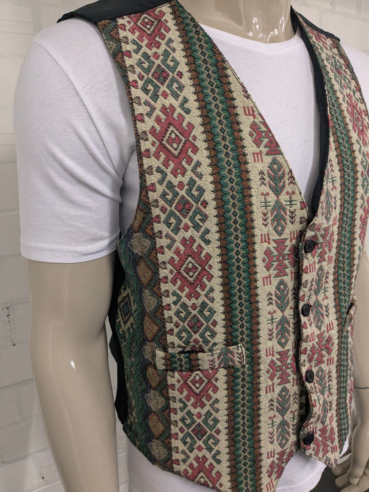 Vintage City gilet. Groen Rood Oranje motief. Maat L.