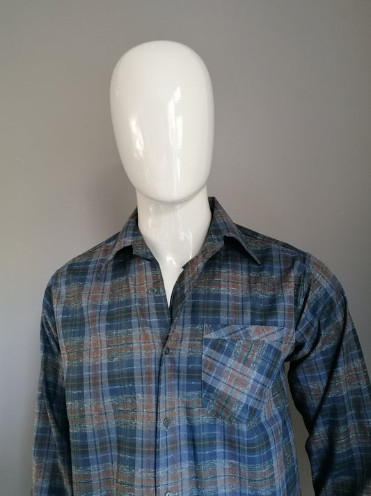 Vintage 70's overhemd met puntkraag. Blauw Bruin geruit. Maat L.