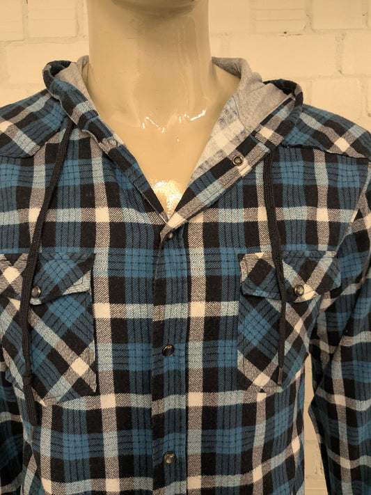 Vintage Merkloos Flanellen overhemd met drukknopen en capuchon. Blauw Wit Zwart geruit. Maat L.