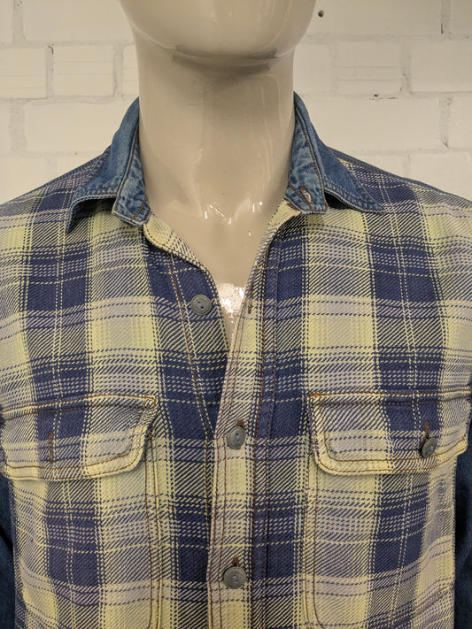 Vintage Easy Way Flanellen overhemd met jeans accenten. Geel Blauw geruit. Maat L.
