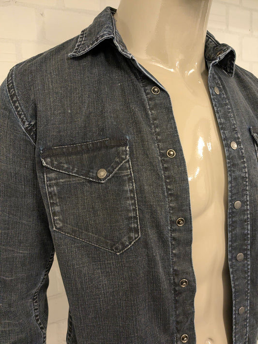 Nudie Jeans co spijkerstof overhemd met drukknopen. Faded Look. Donker Blauw gekleurd. Maat S.