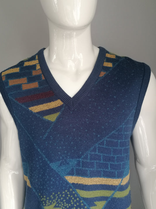 Vintage Gino di Roma Wollen spencer. Donker Blauw Geel Groen gekleurd. Maat L.