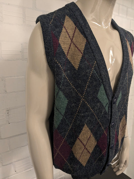 Vintage Wollen spencer met V-Hals. Donker Blauw Rood Groen Paars gekleurd. Maat L.