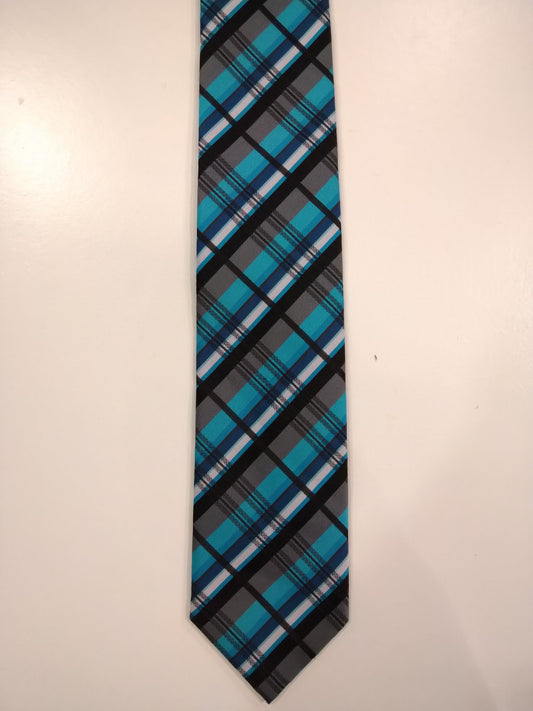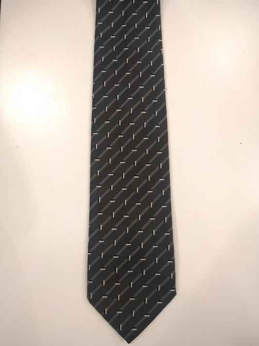 Fletchers Gallery polyester stropdas. Grijs zwart turquoise gestreept motief.