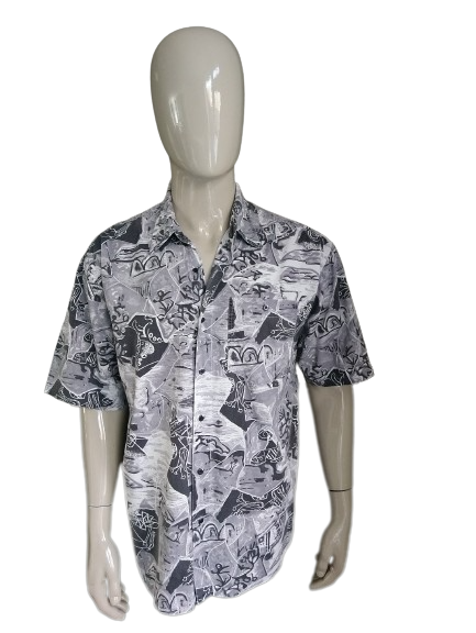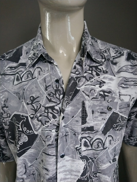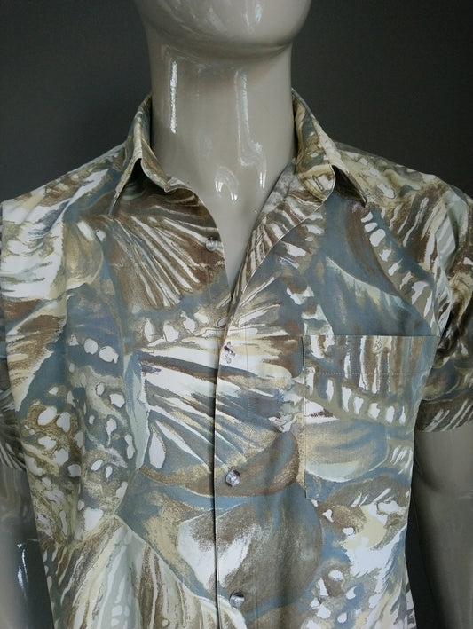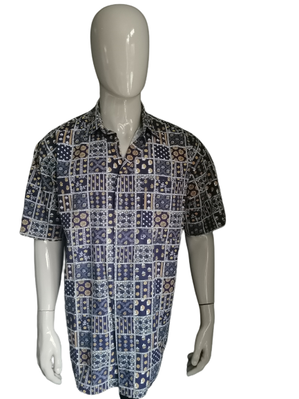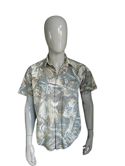 Vintage neues schnelles Hemd Kurzarm. Blaubrauner Druck. Größe L / XL.