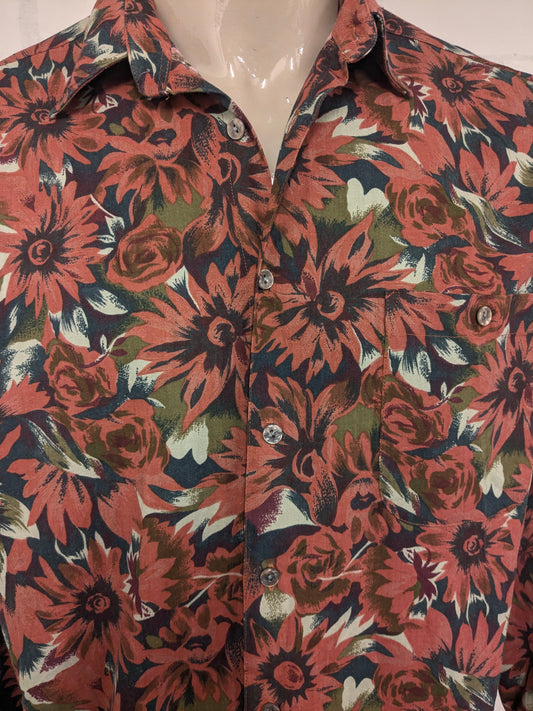 Vintage John F. Gee Hemd. Orangegrüner Blumendruck. Größe XL.