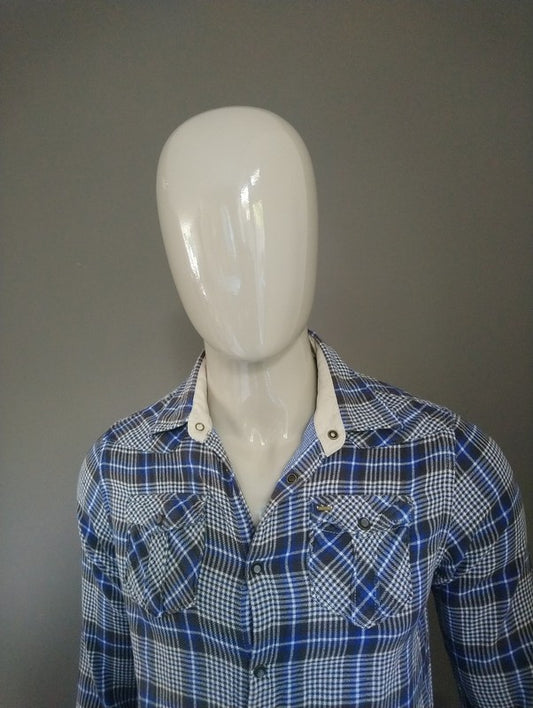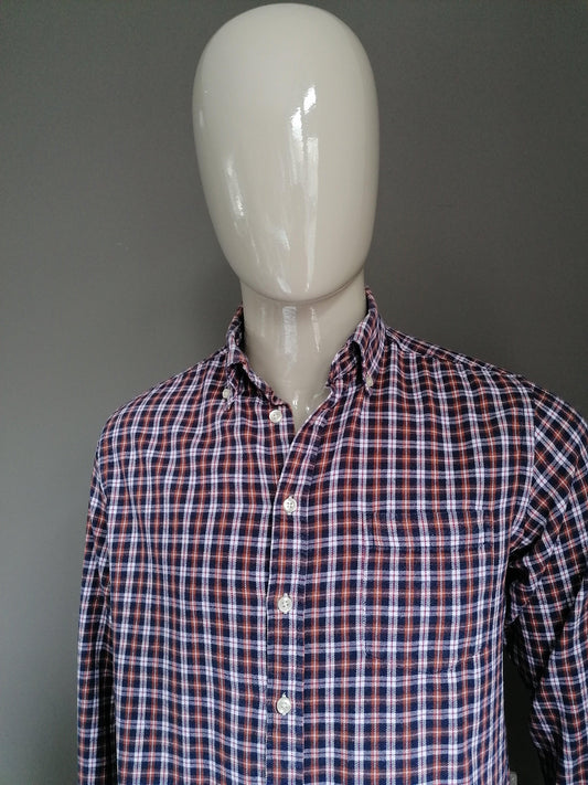 Kaprons-Hemd. Blaues Rot kariert mit Anwendungen. Größe L. Slim Fit.