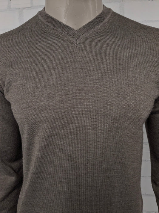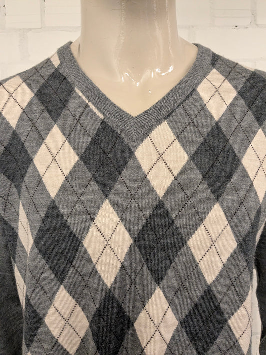 Punto Setta Merion Woollenpullover mit V-Ausschnitt. Beige Grey Argyle Motiv. Größe 2xl / xxl. 100% Wolle.