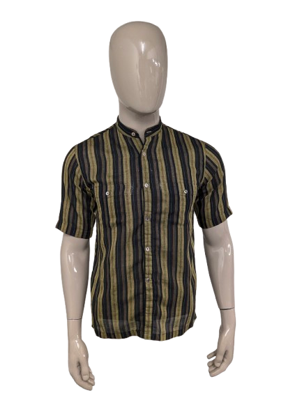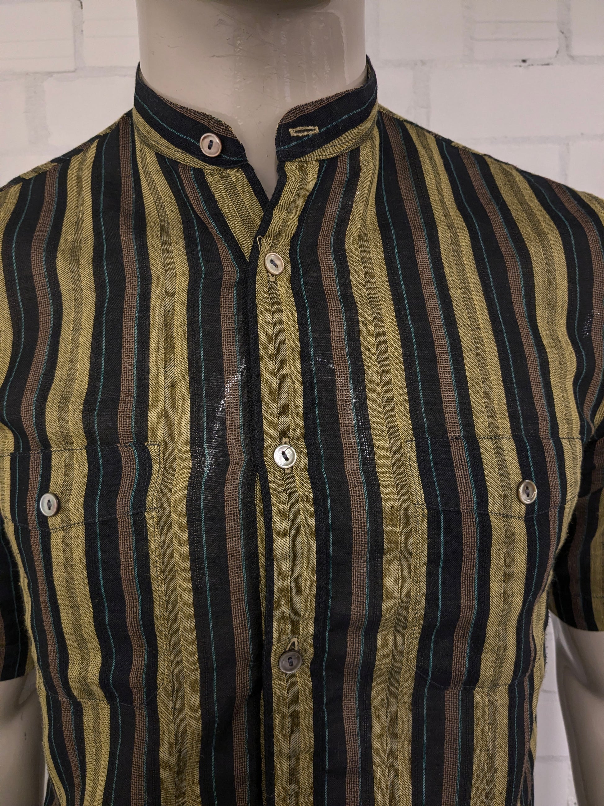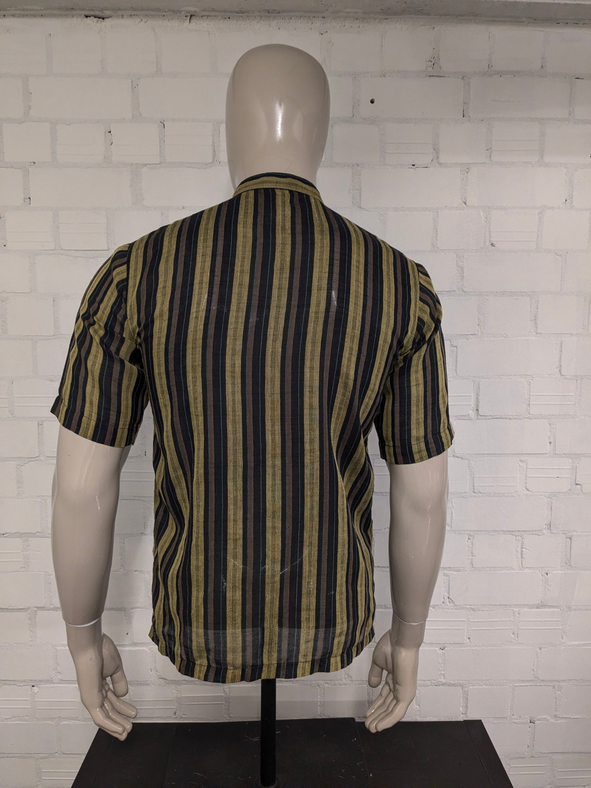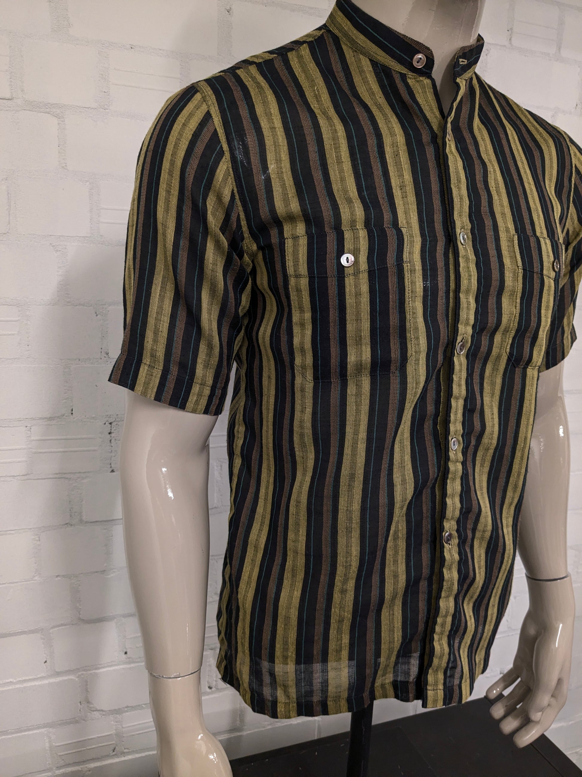 Escort-Hemd mit kurzen Ärmeln und kurzem Bauernkragen. Grün Braun Blau gestreift. Größe M.