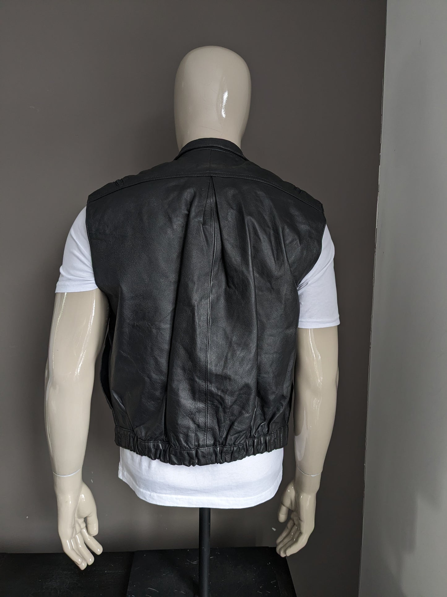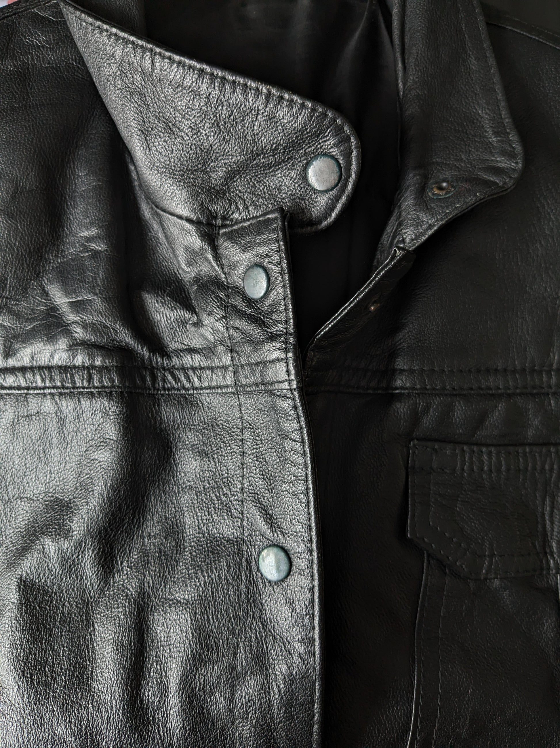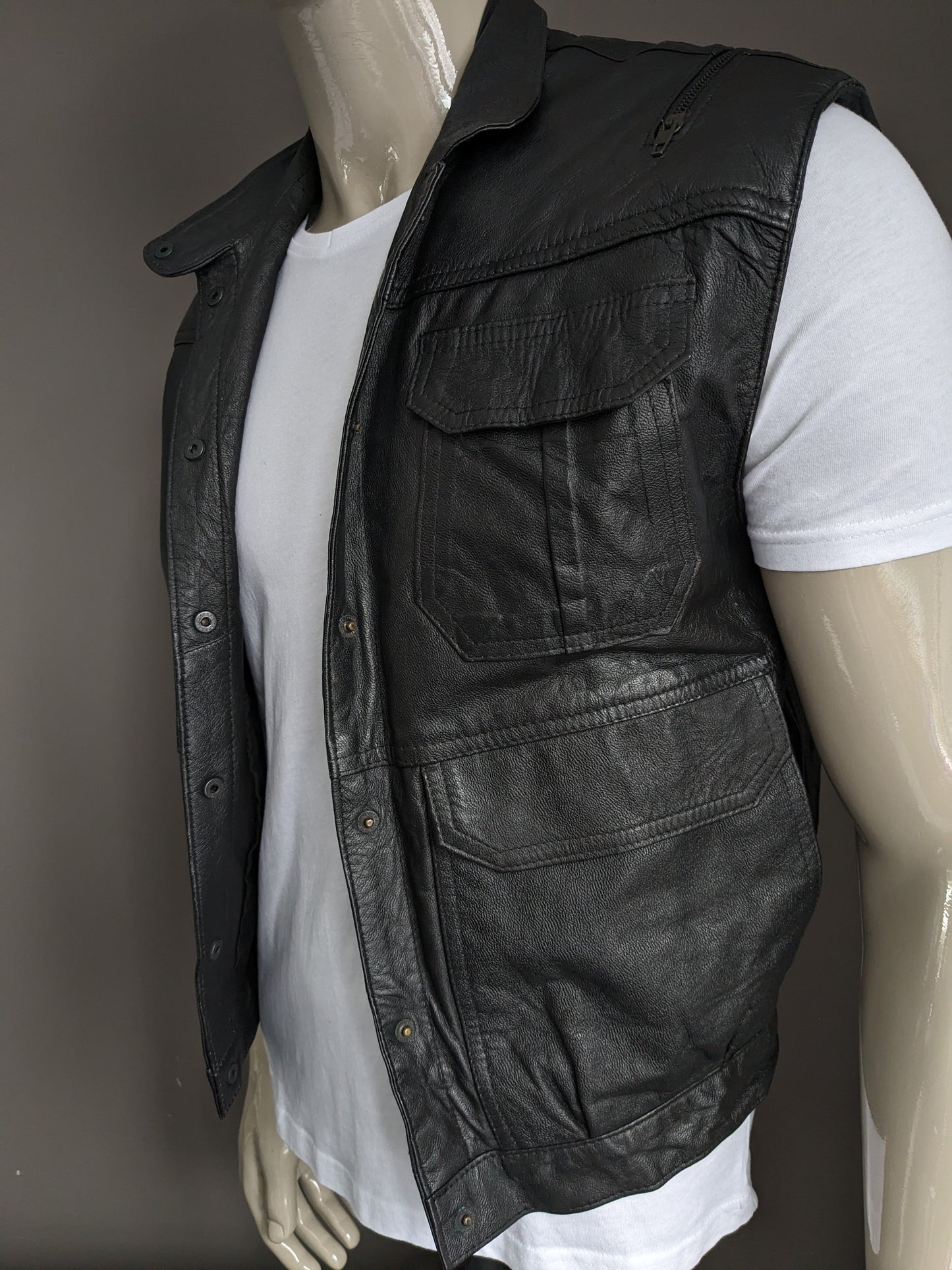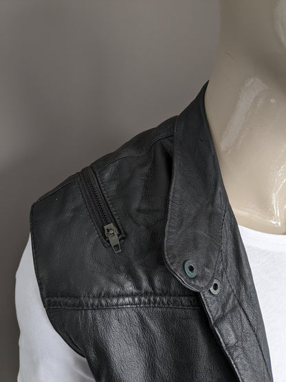 Vintage 80er Jahre C & A Leder Körperwärmer / Weste mit Taschen, Reißverschlussanwendungen und Pressestollen. Schwarz. Größe M.