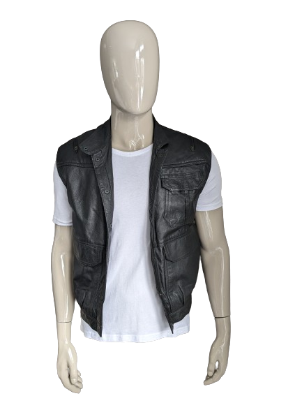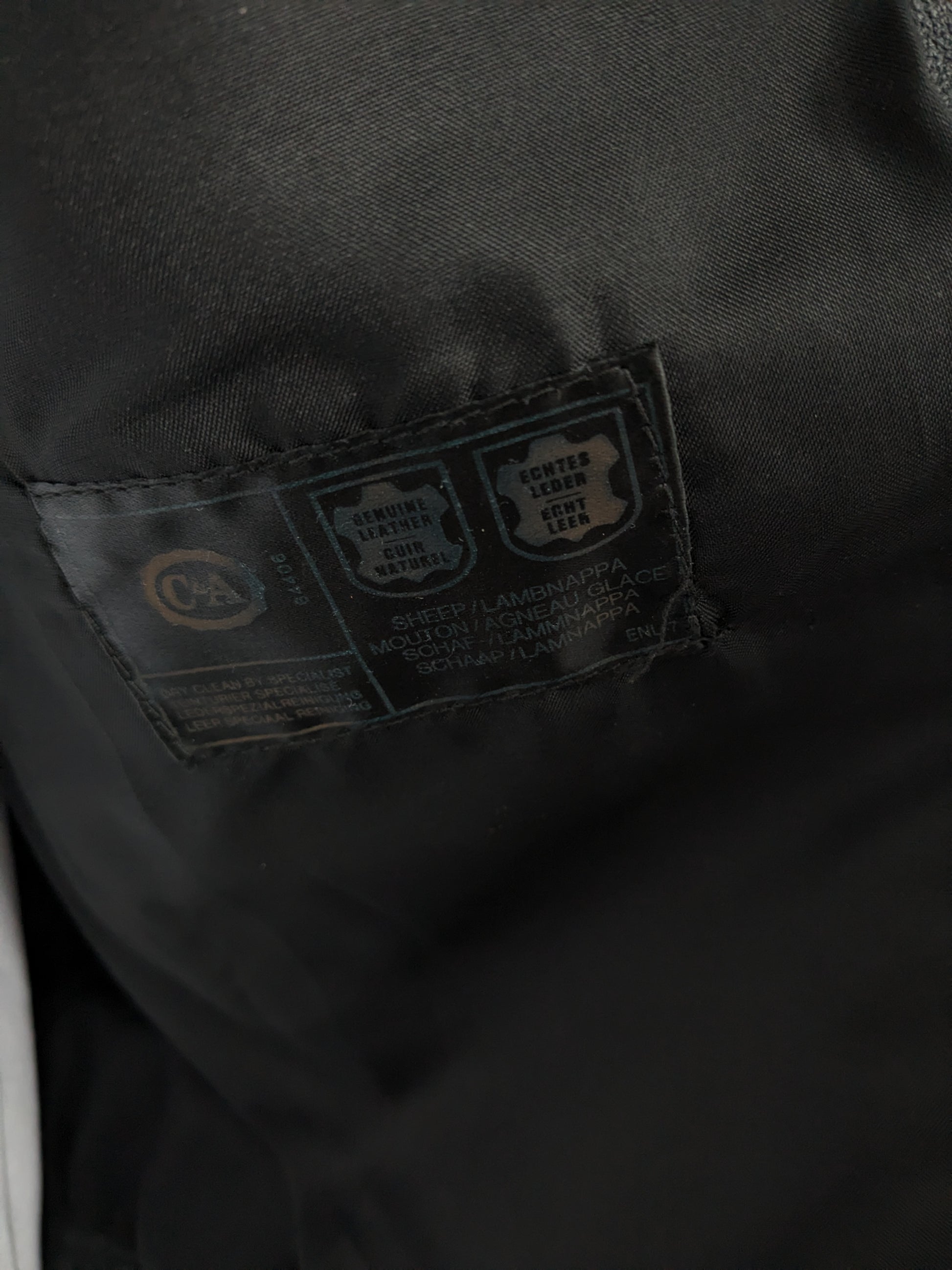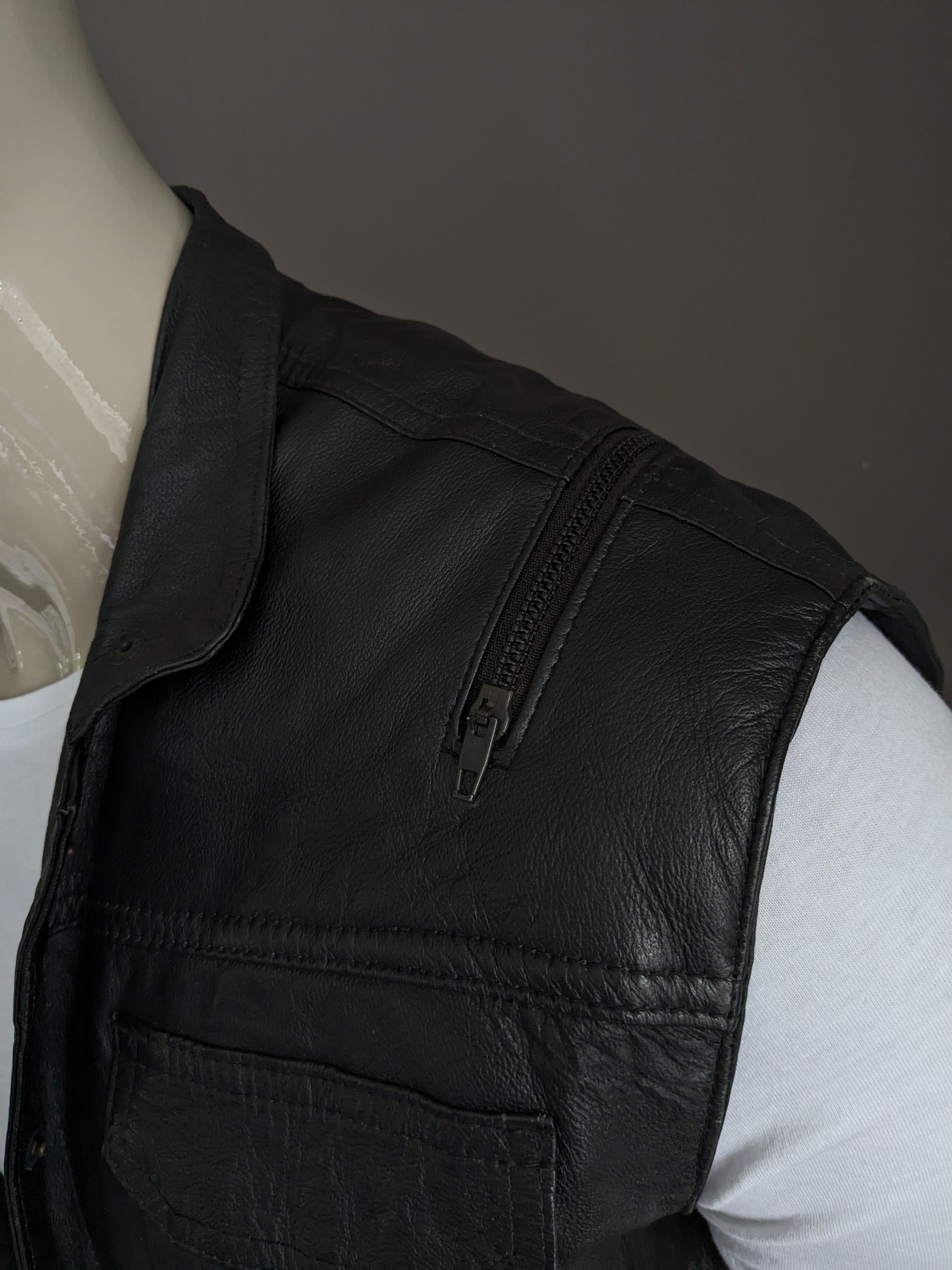 Vintage 80er Jahre C & A Leder Körperwärmer / Weste mit Taschen, Reißverschlussanwendungen und Pressestollen. Schwarz. Größe M.