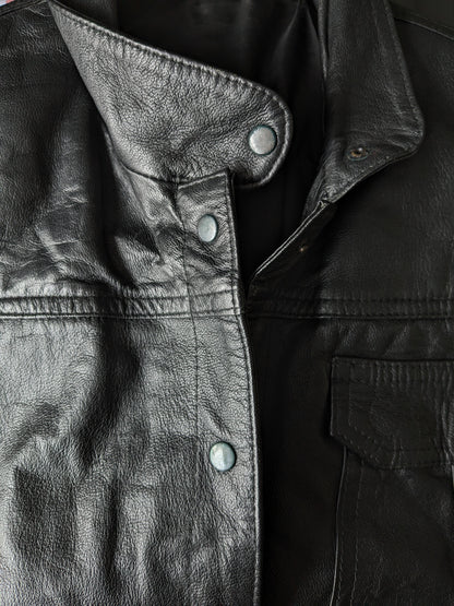 Dieser Vintage -Körperwärmer / Weste aus den 80ern stammt aus der bekannten Marke C & A. Es besteht aus hochwertigem Leder und hat eine coole schwarze Farbe. Der Körperwärmer ist mit praktischen Taschen, Reißverschlussanwendungen und Pressebosen ausgestattet, um einen besonders harten Look zu erzielen.