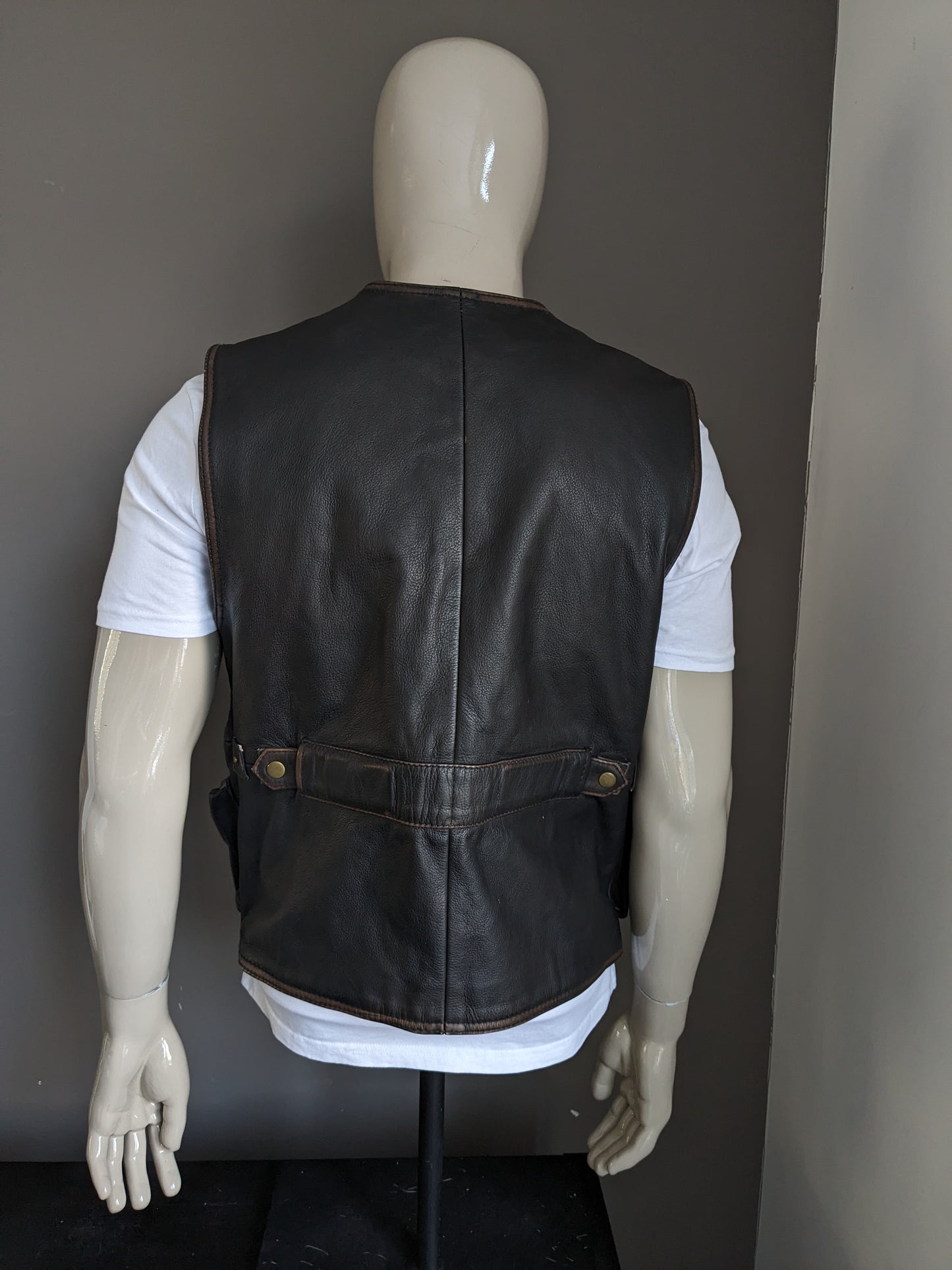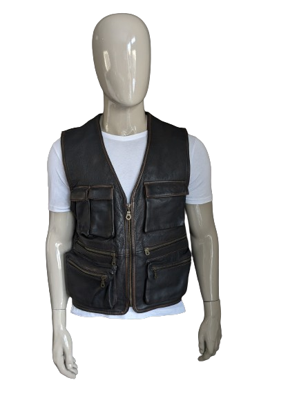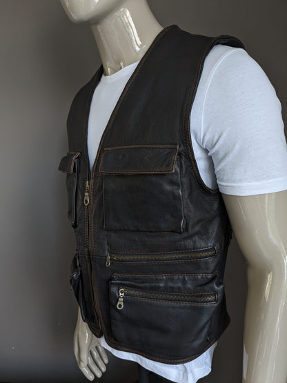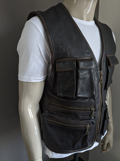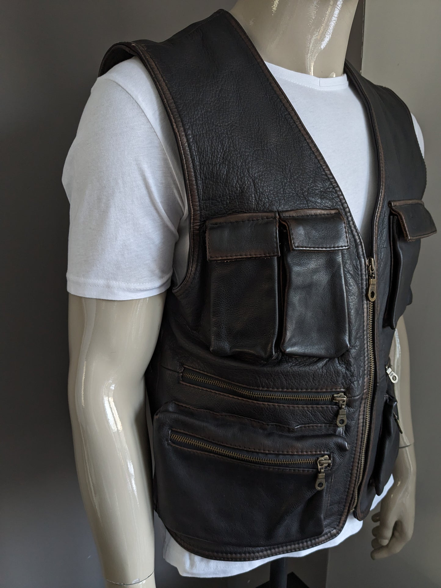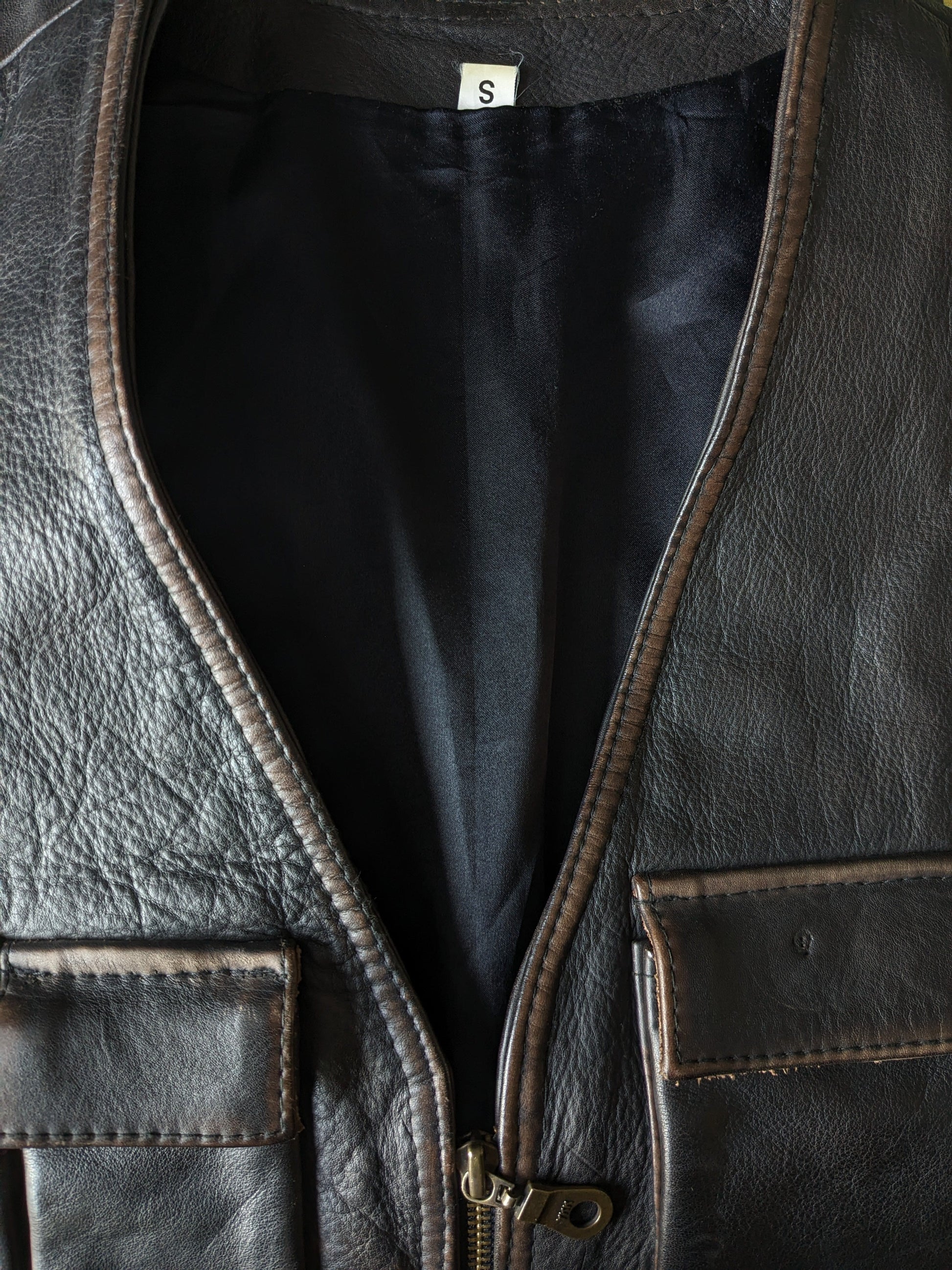 Vintage 80s 90er Jahre Leder Körperwärmer / Gilet mit vielen Taschen und 2 Innentaschen. Dunkelbraun. Größe S / M.