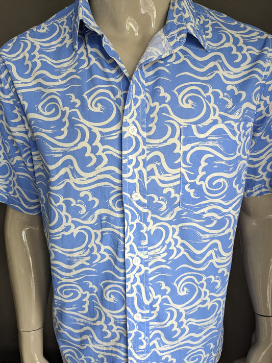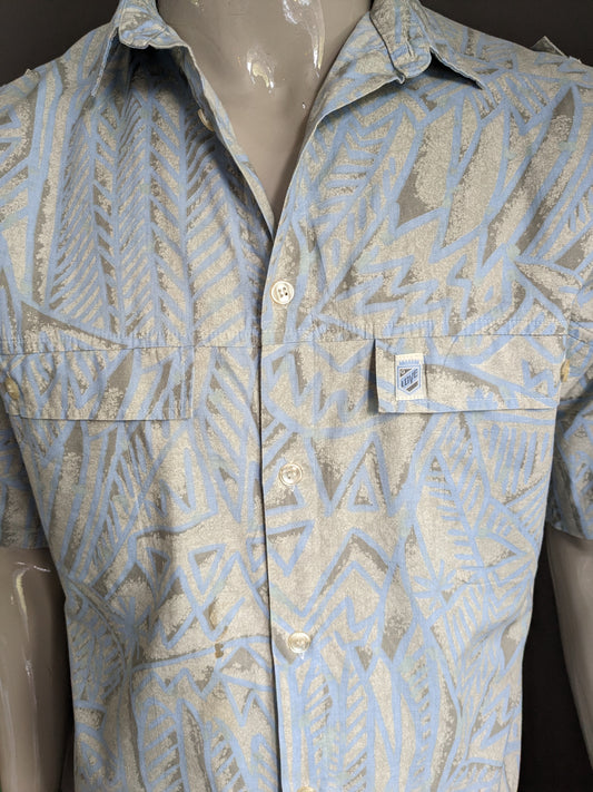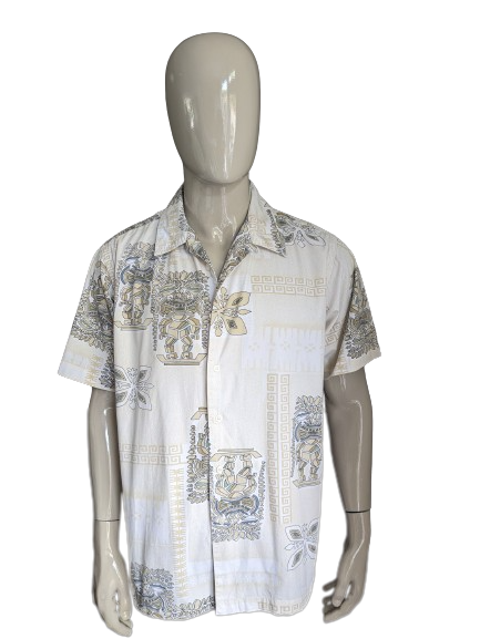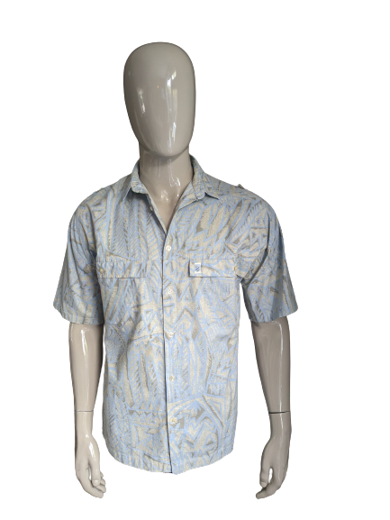 Vintage print shirt short sleeve. Beige gray blue print. Size XL.