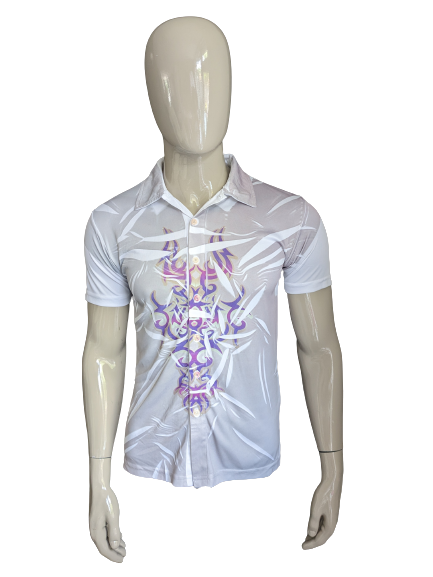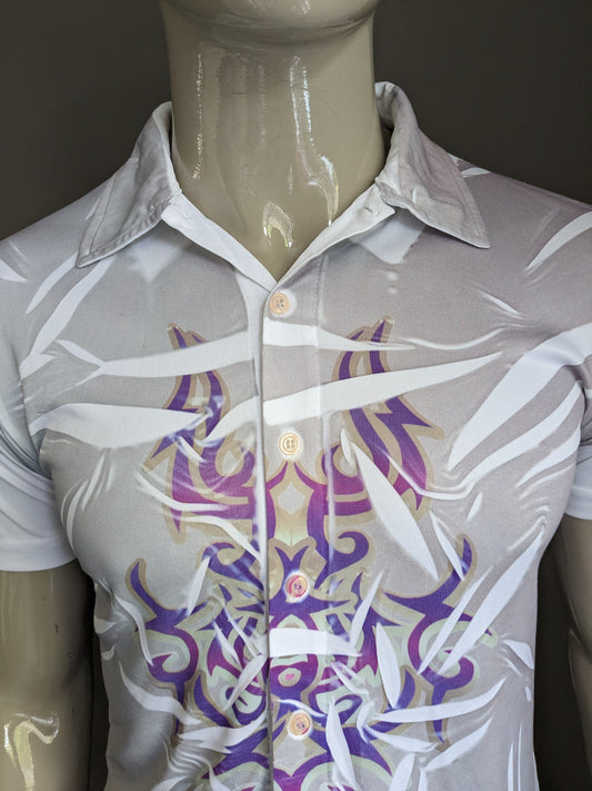 Vintage 90's silverstone shirt short sleeve. Purple green white print. Size L.
