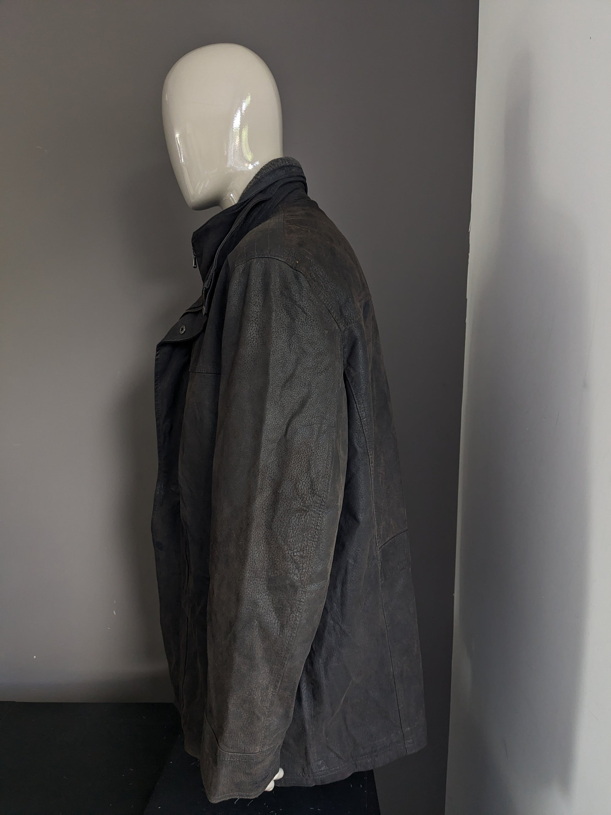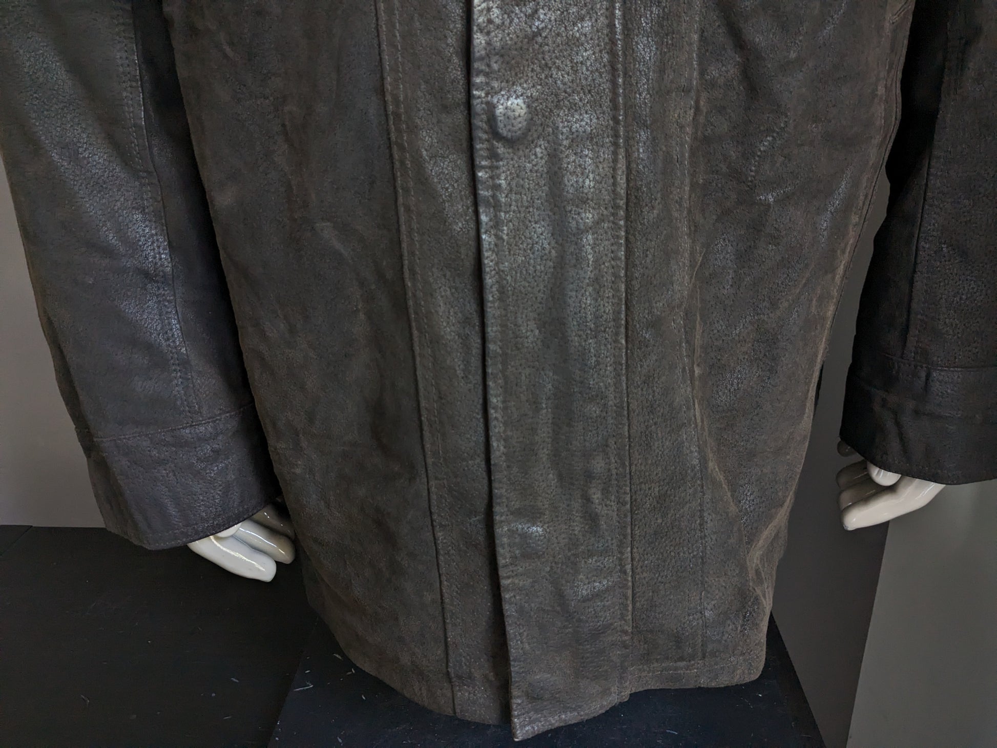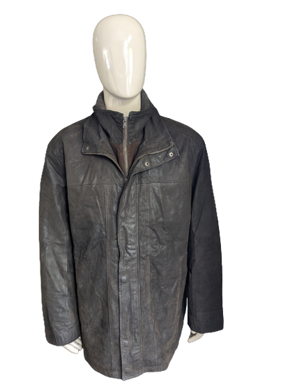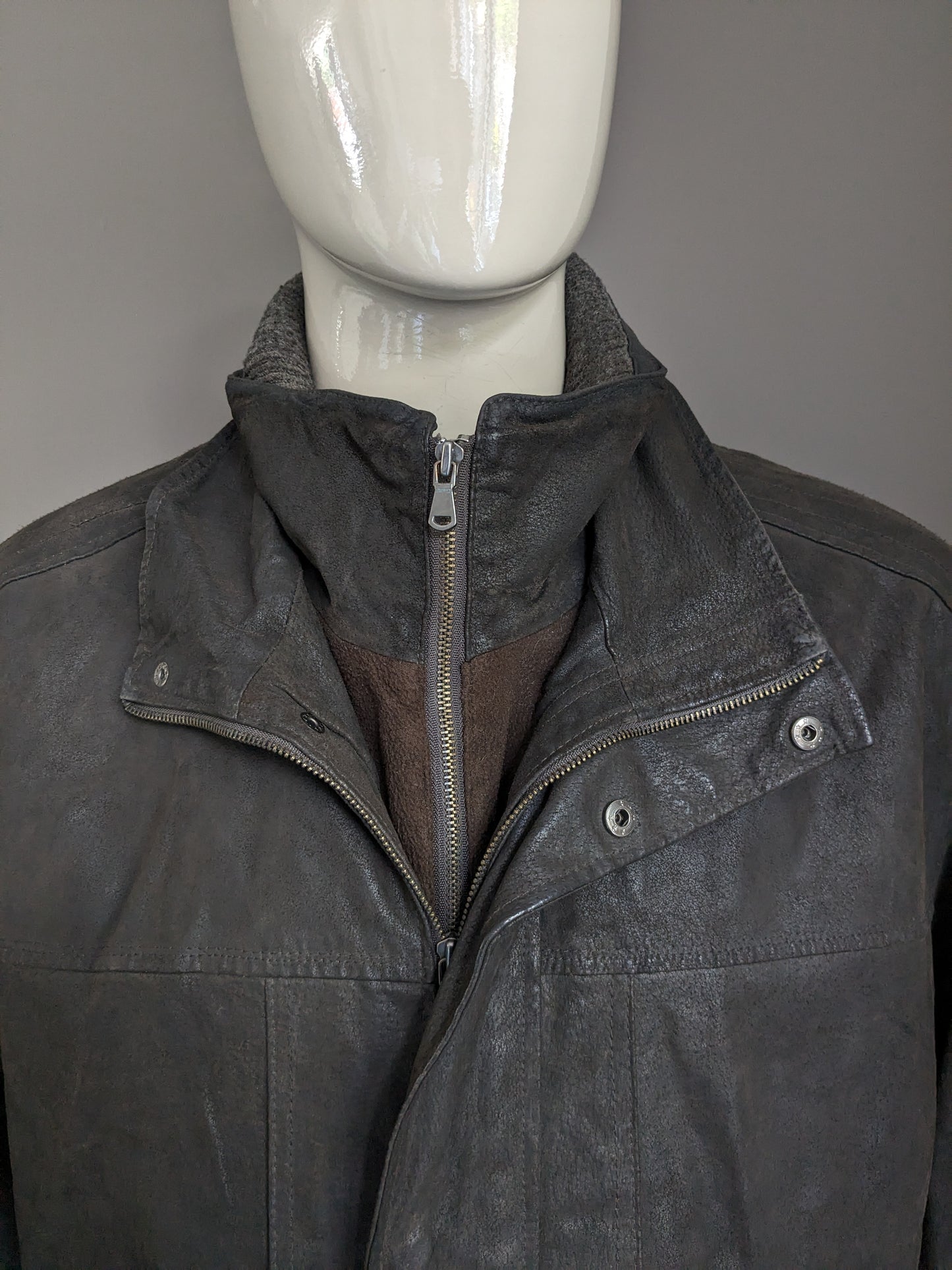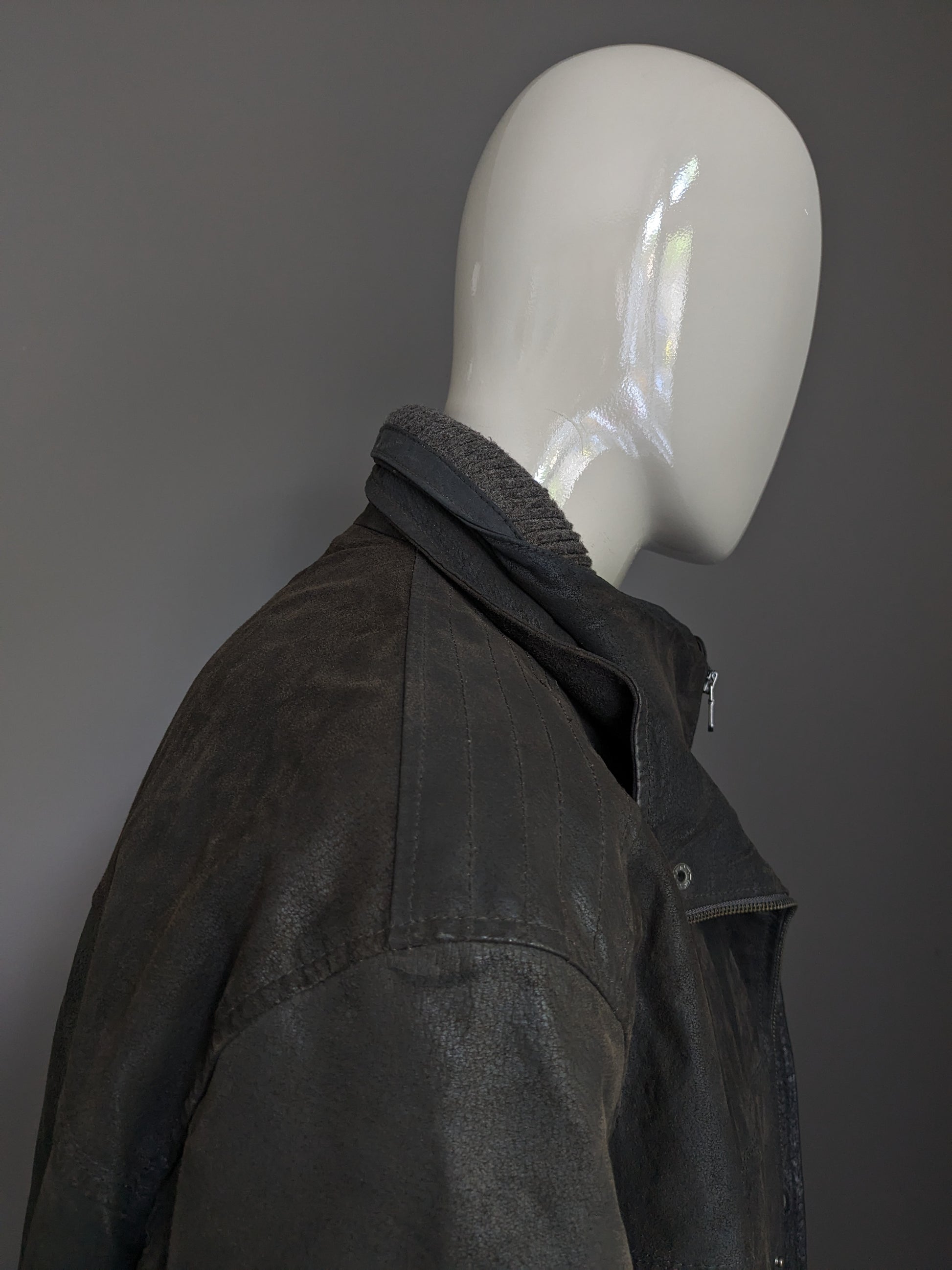 Leather style semi -long leather jacket. Dark brown colored. With detachable double closure and collar. Size 62-64/ 3XL.