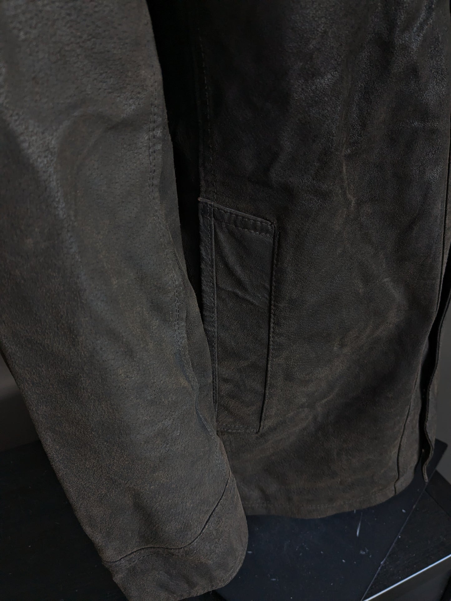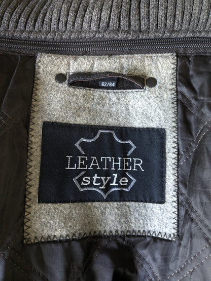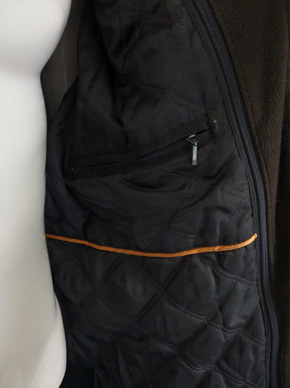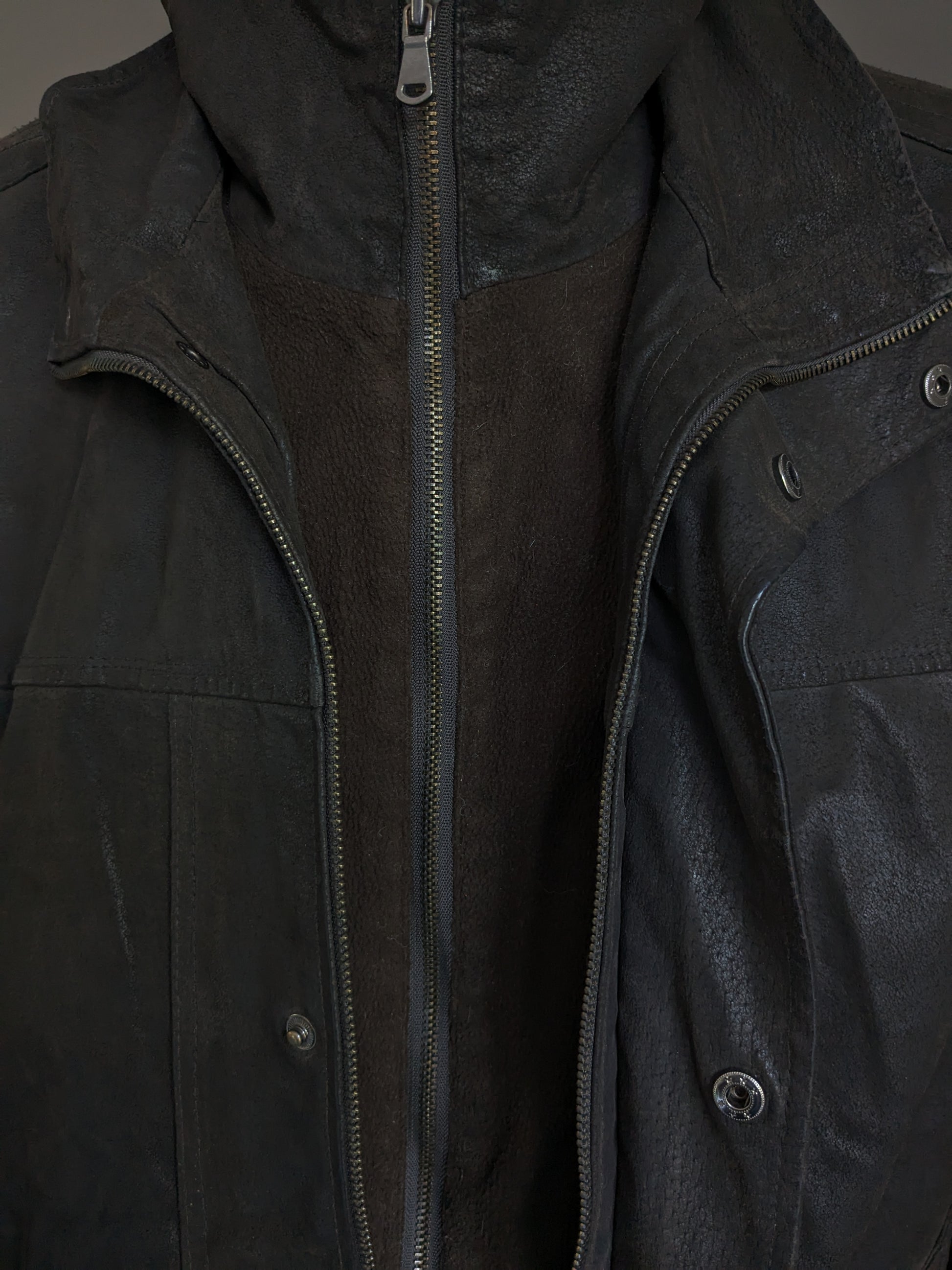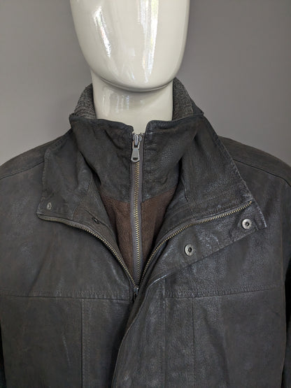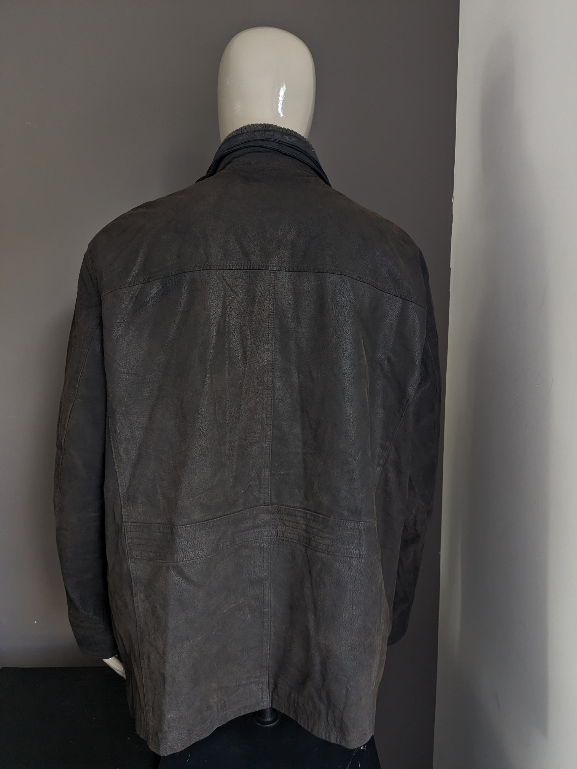 Leather style semi -long leather jacket. Dark brown colored. With detachable double closure and collar. Size 62-64/ 3XL.