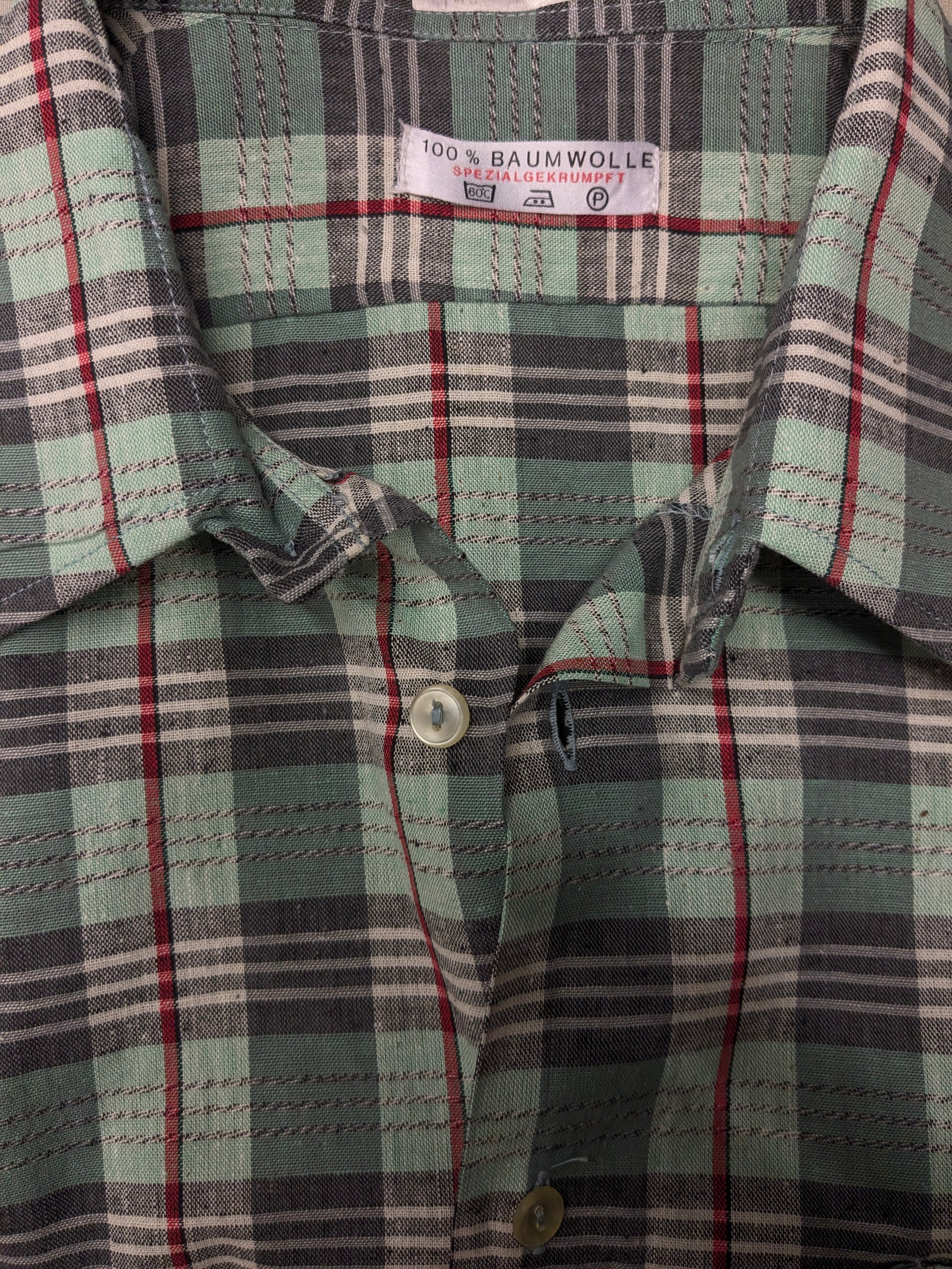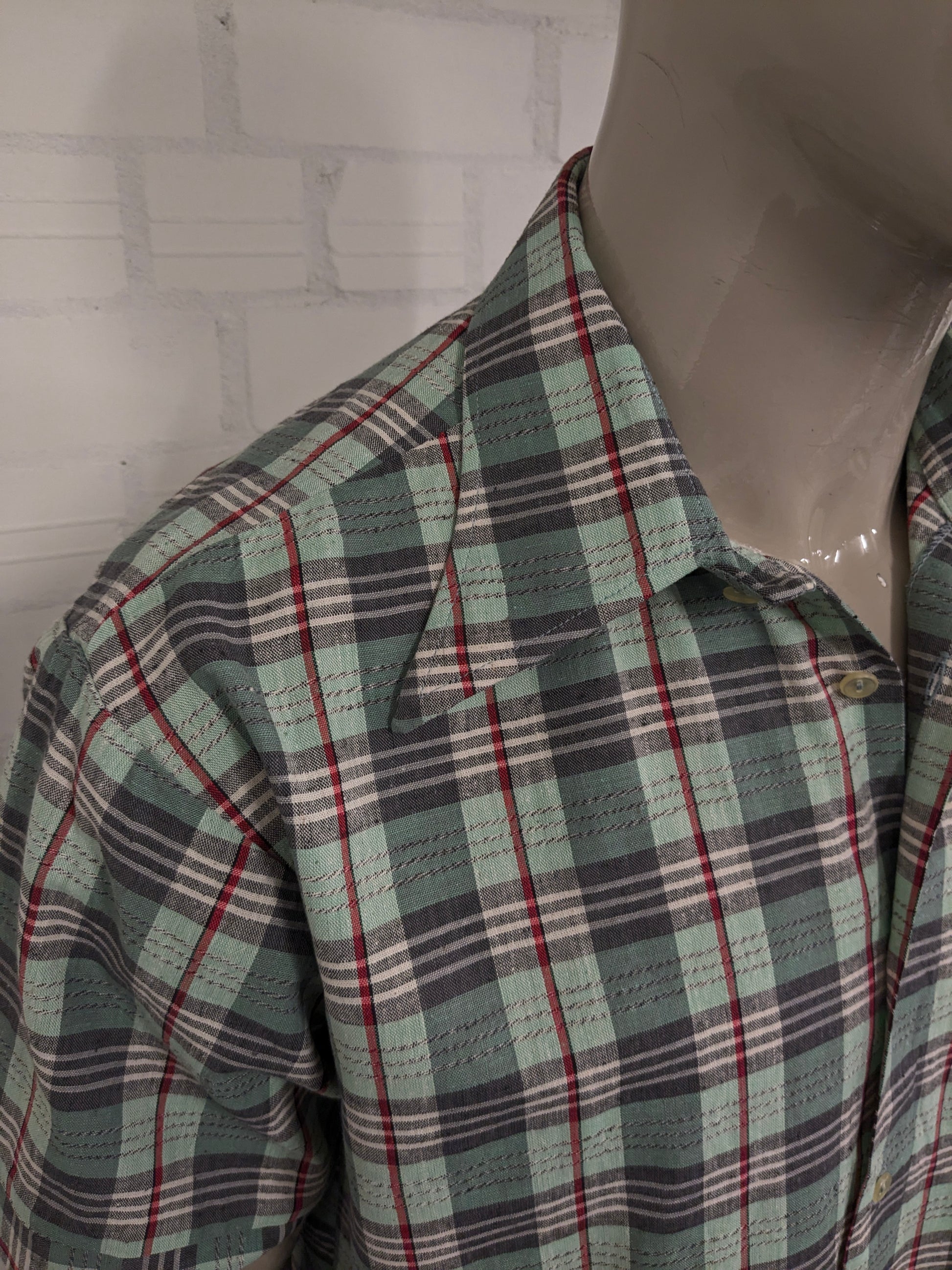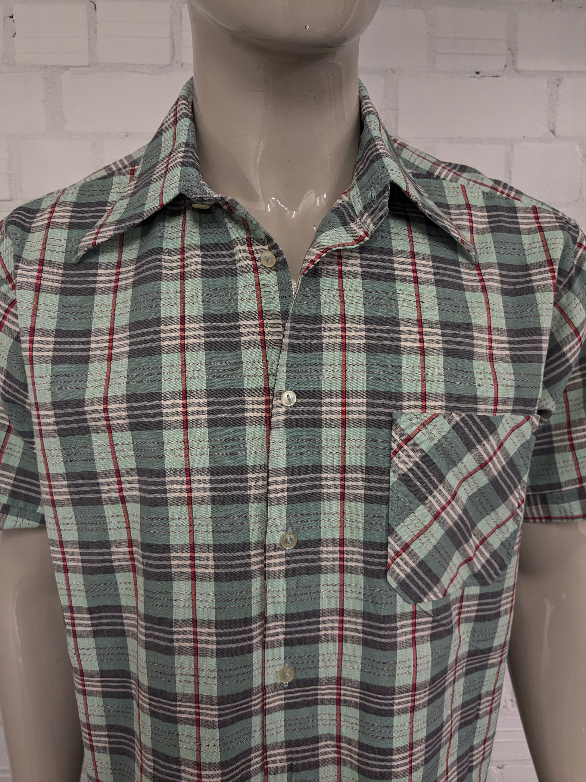 Vintage 70's shirt short sleeve with point collar. Green rose white black checked. Size XL.