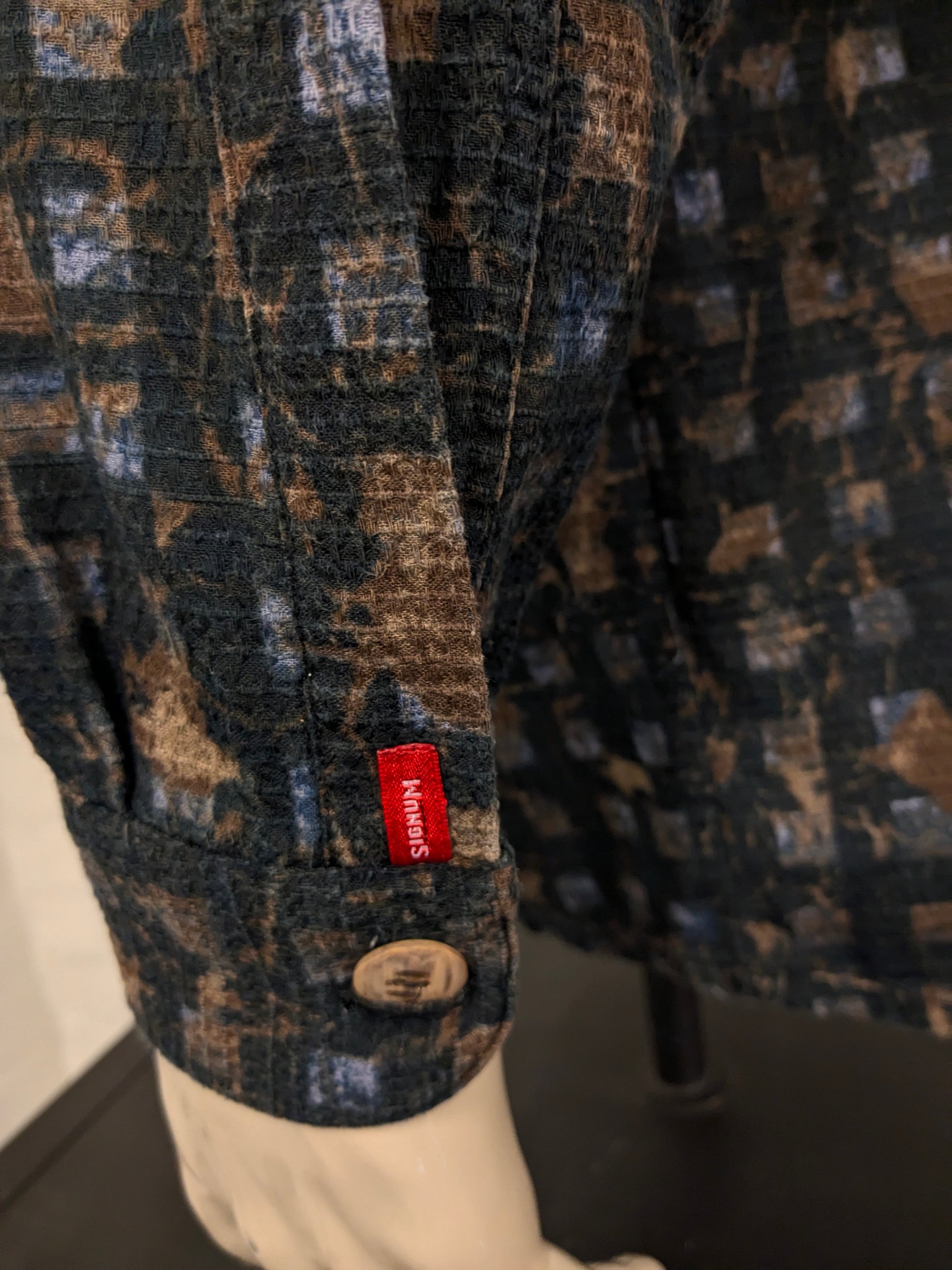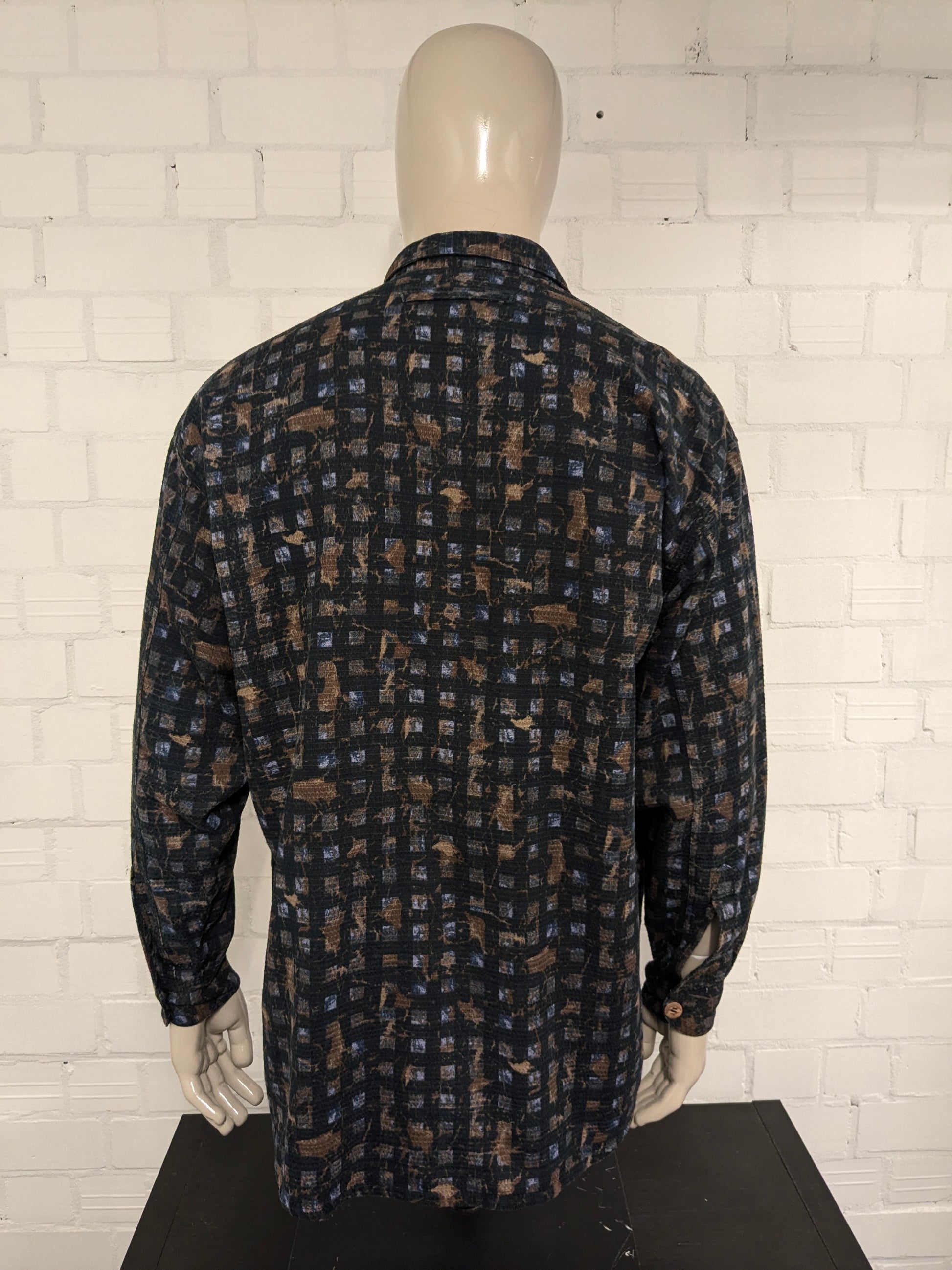 Vintage Signum shirt with large buttons. Black brown blue print. Size XL.
