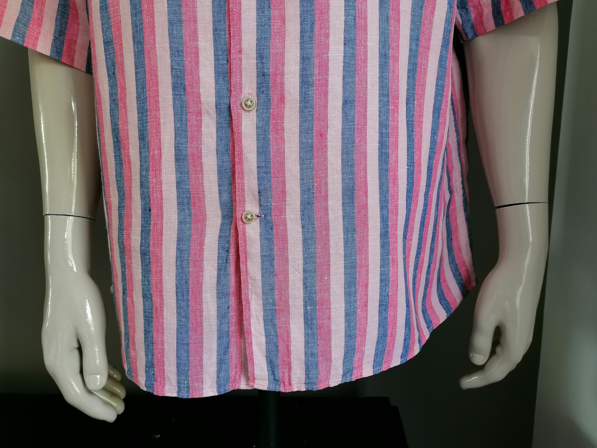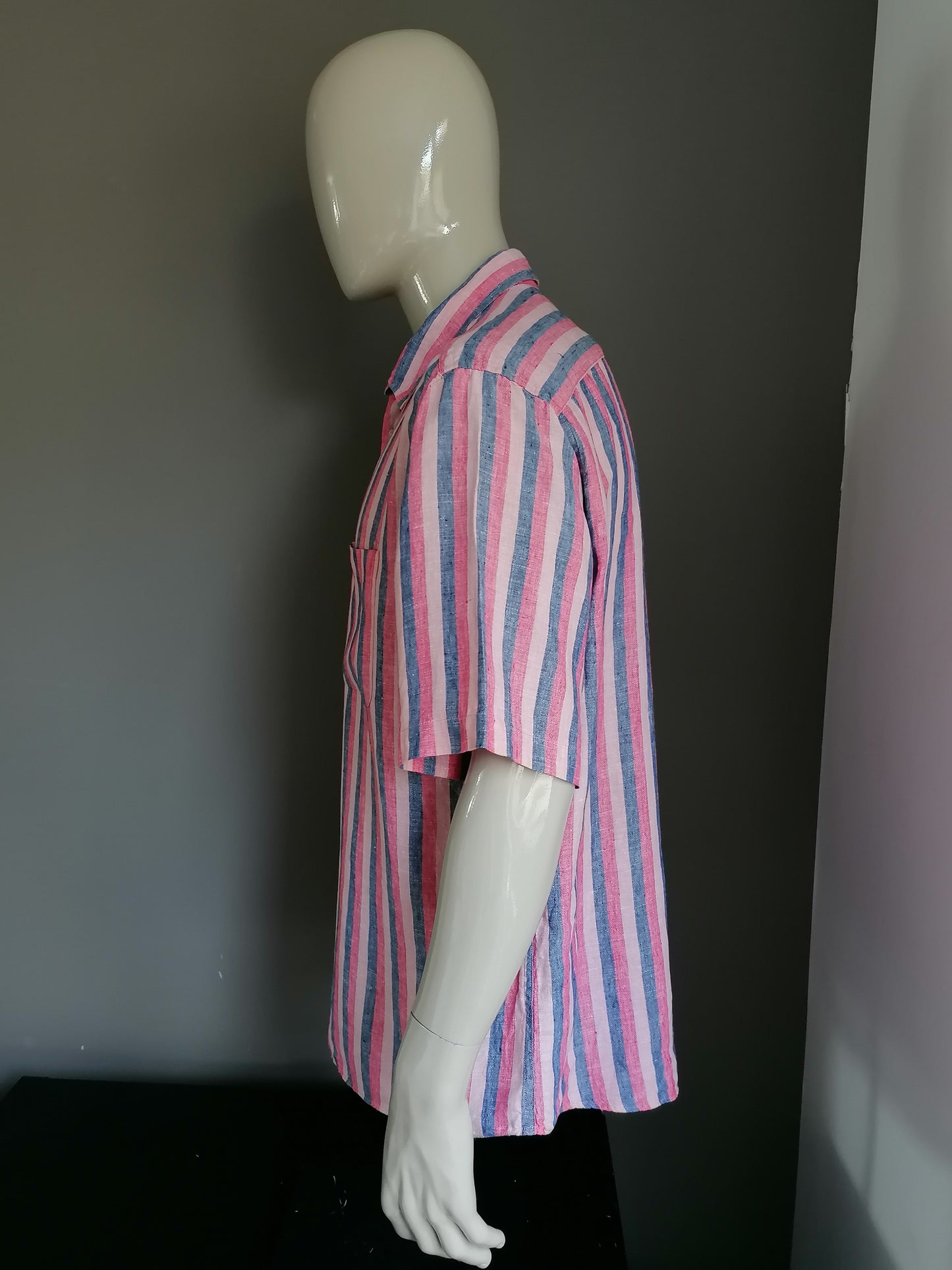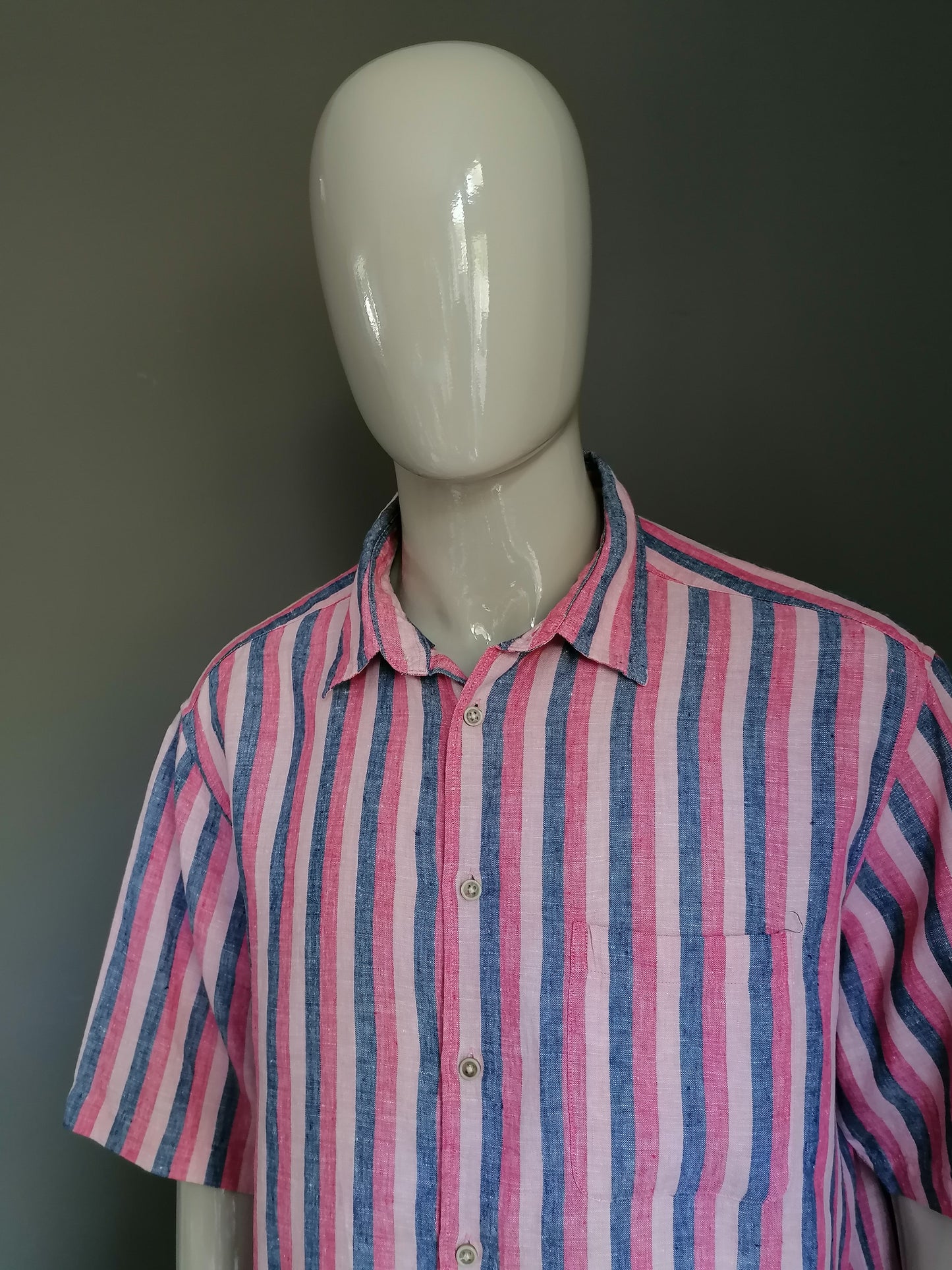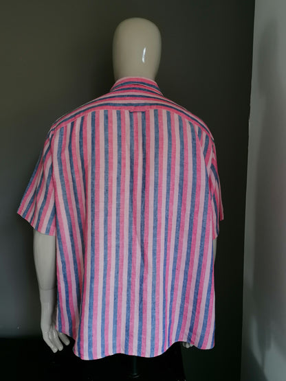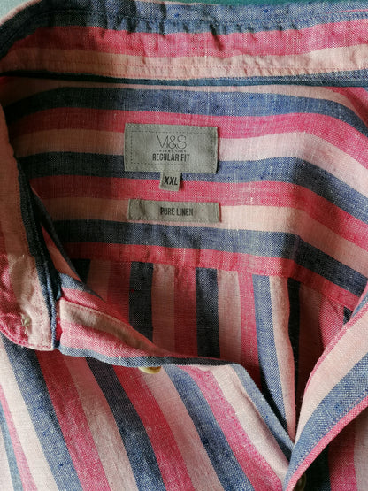 Marks & Spencer Linen Shirt Short Sleeve. Blue pink striped motif. Size XXL. Regular fit.