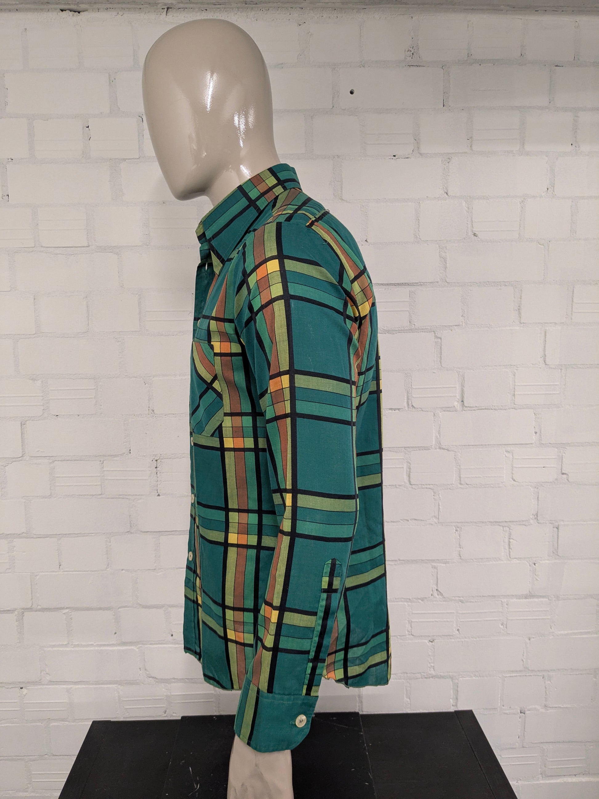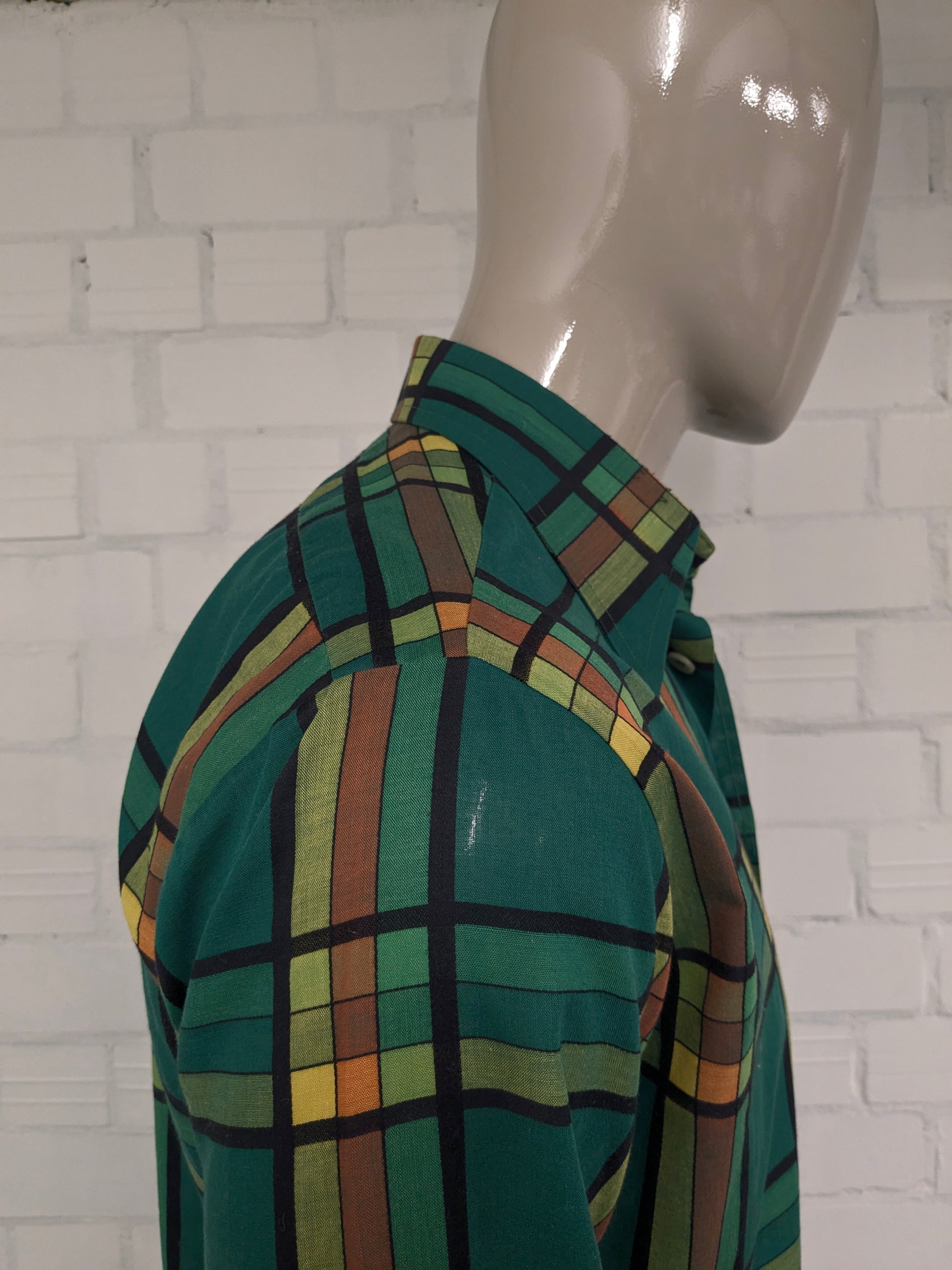 Vintage 70's Modell Paris shirt with point collar. Green yellow orange black checked. Size L.