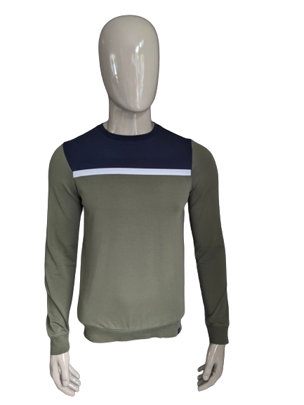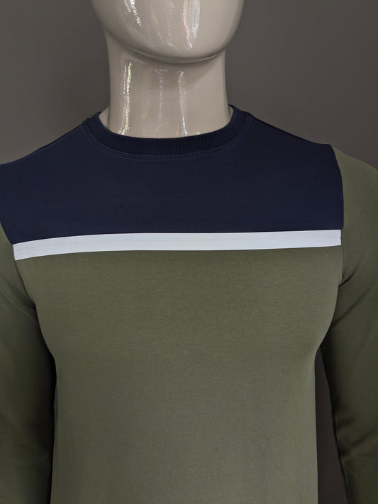 Blue industry sweater with V-neck and elbow patches. Green blue striped. Size XL.