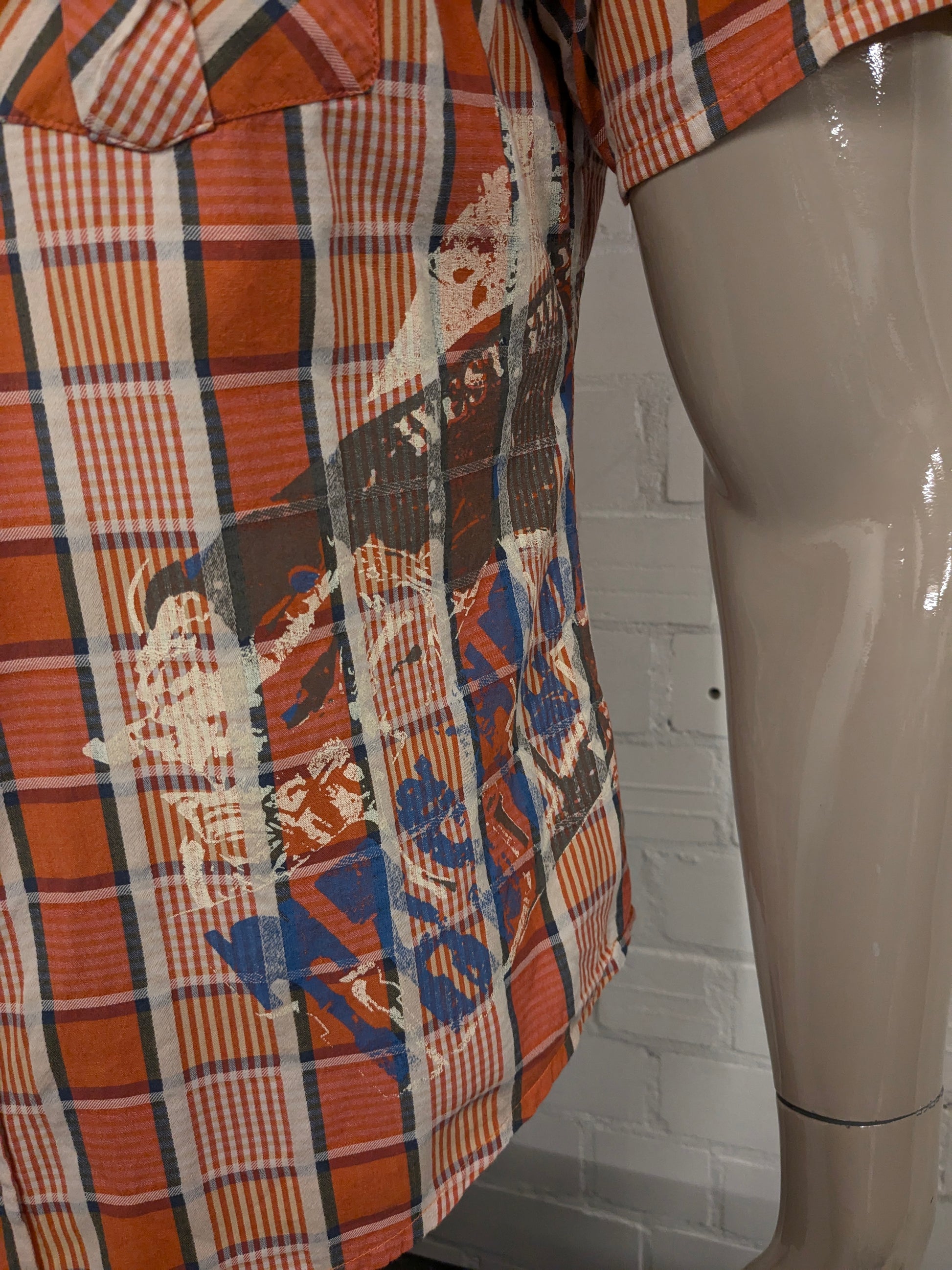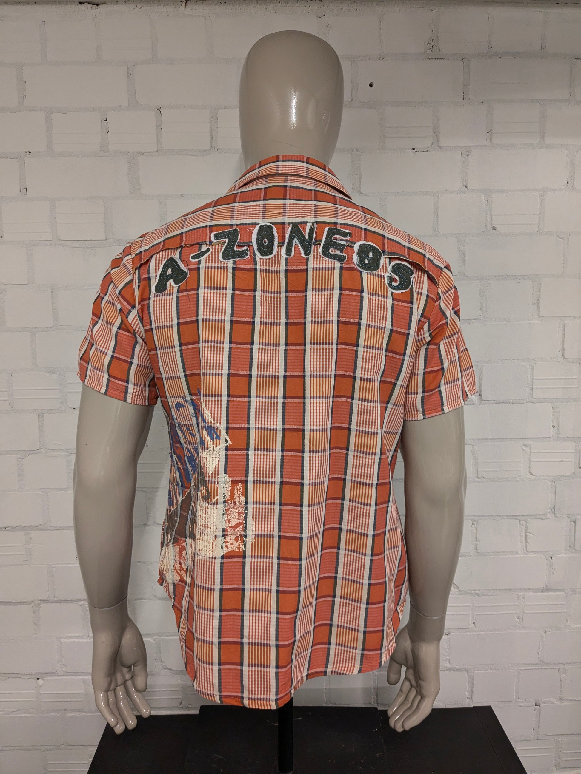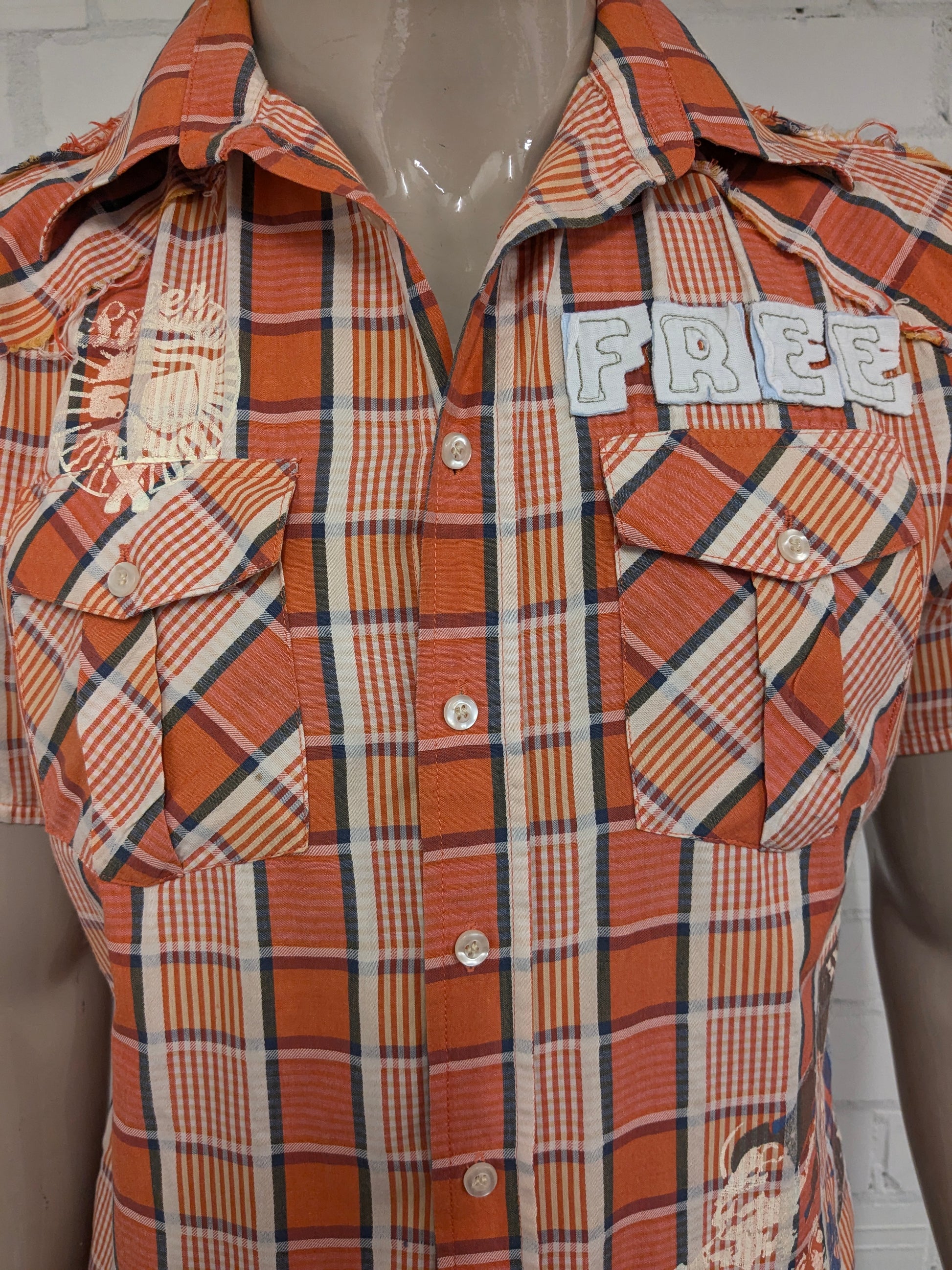 Camisa color aguamarina manga corta. Naranja Amarillo Azul marcado. con aplicaciones. Talla M.