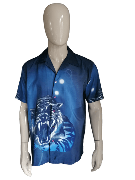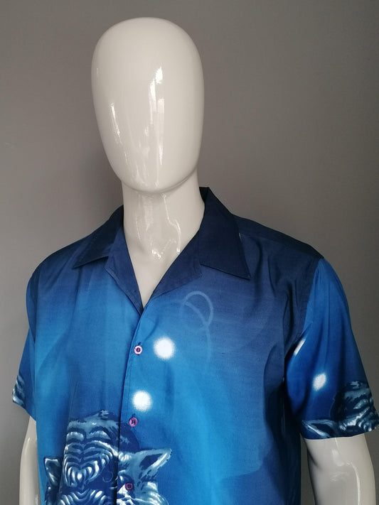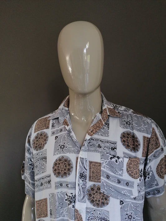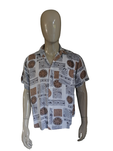Camisa de manga corta vintage. Impresión azul marrón amarillo 90. Tamaño XL