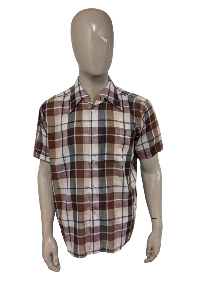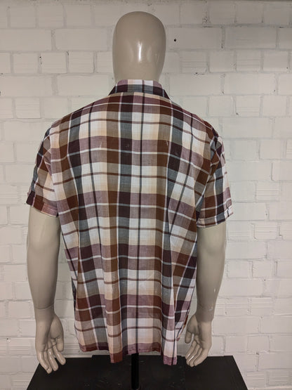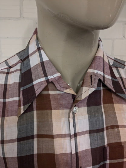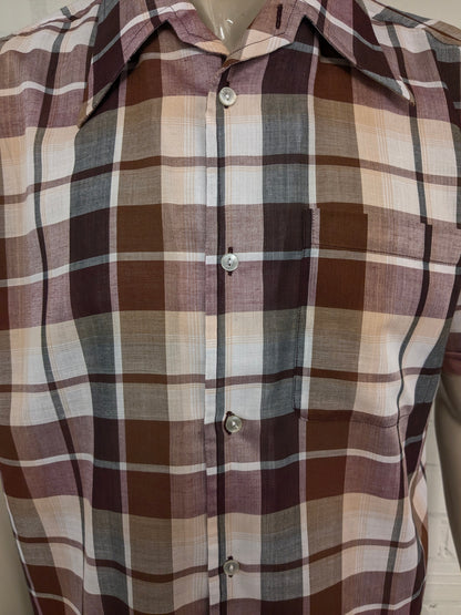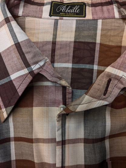 Camisa de Abeille de los 70 años con cuello puntual y manga corta. Burdeos Beige Brown marcado. Tamaño xl.