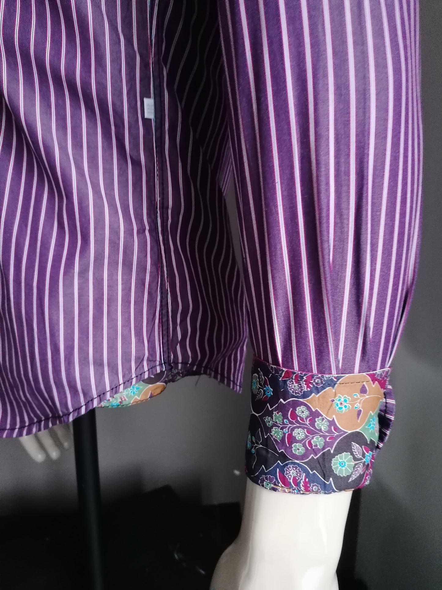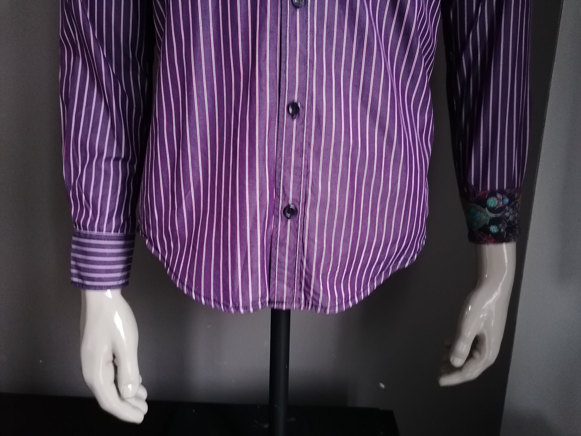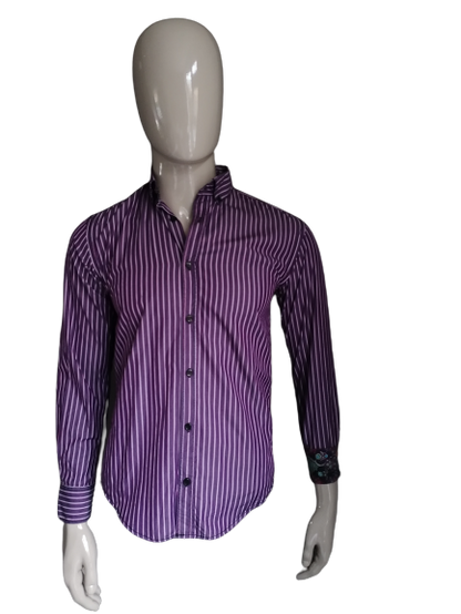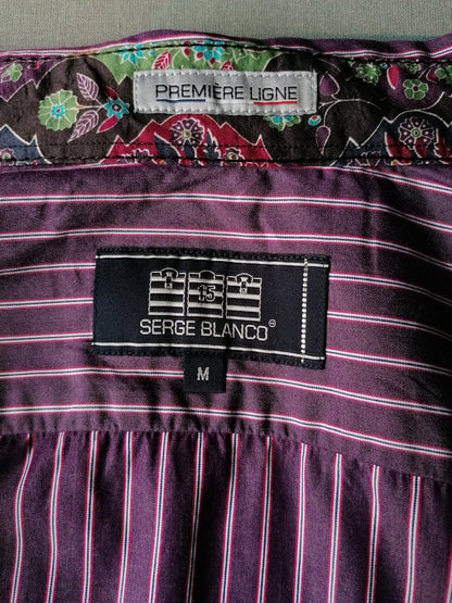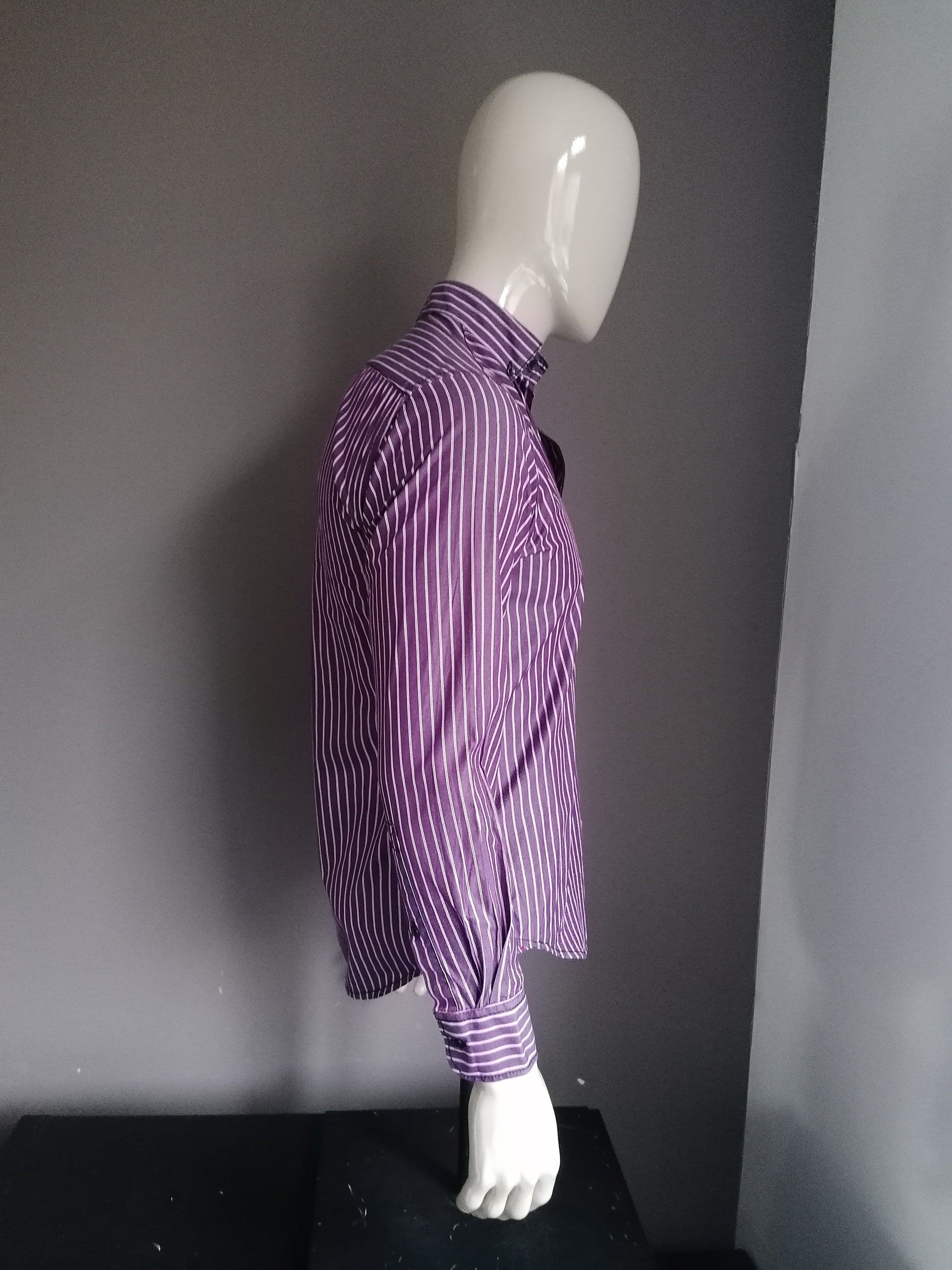 Serge camisa en blanco. Motivo rayado púrpura. Talla M