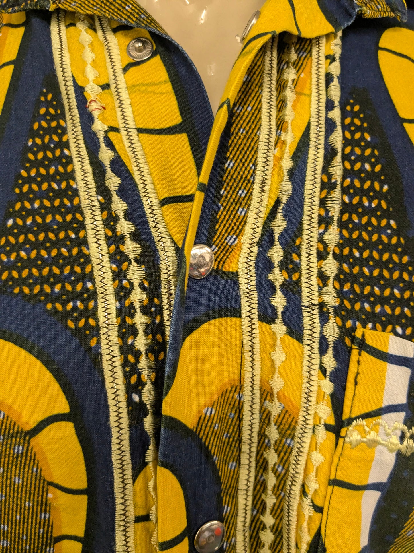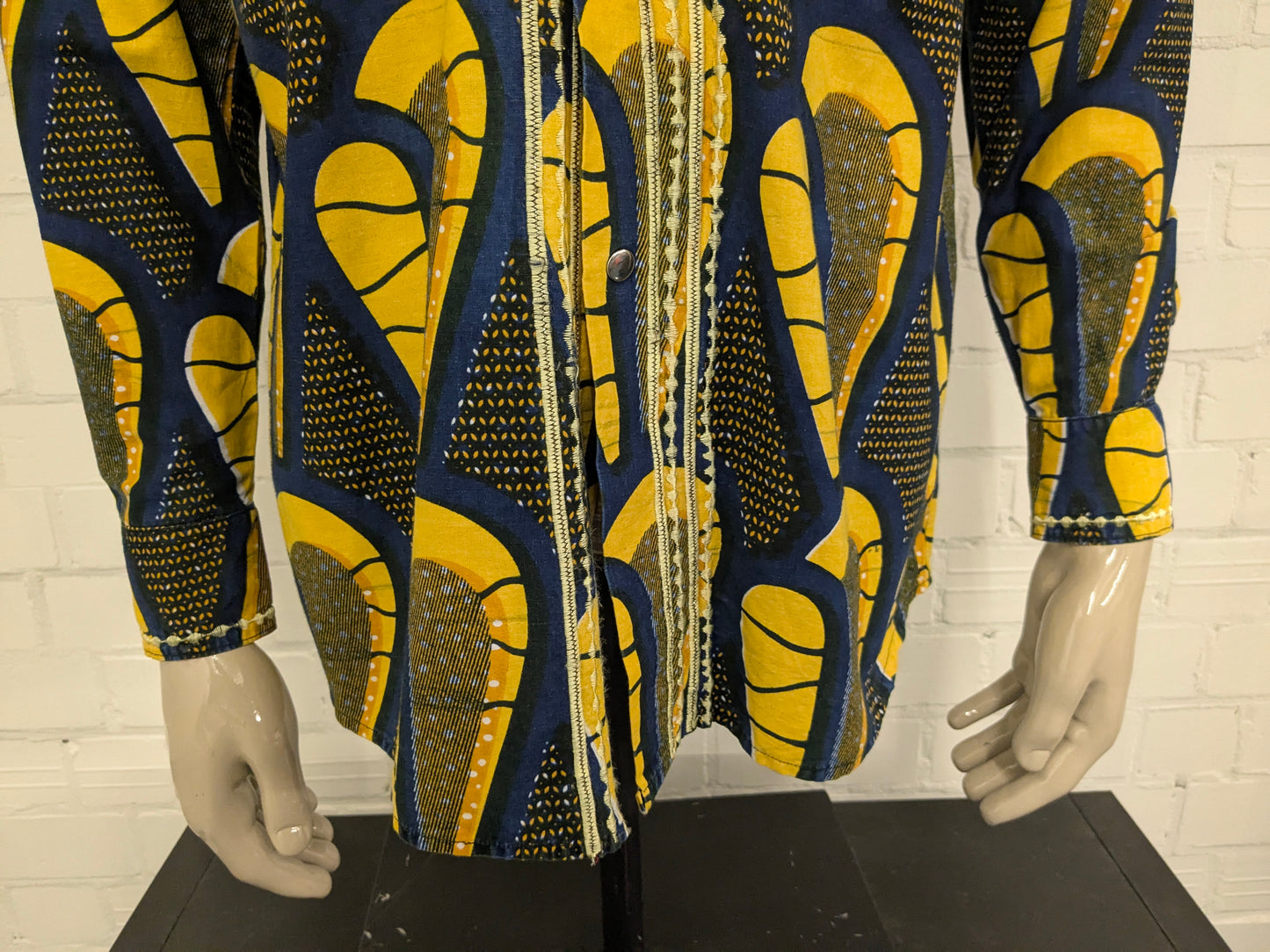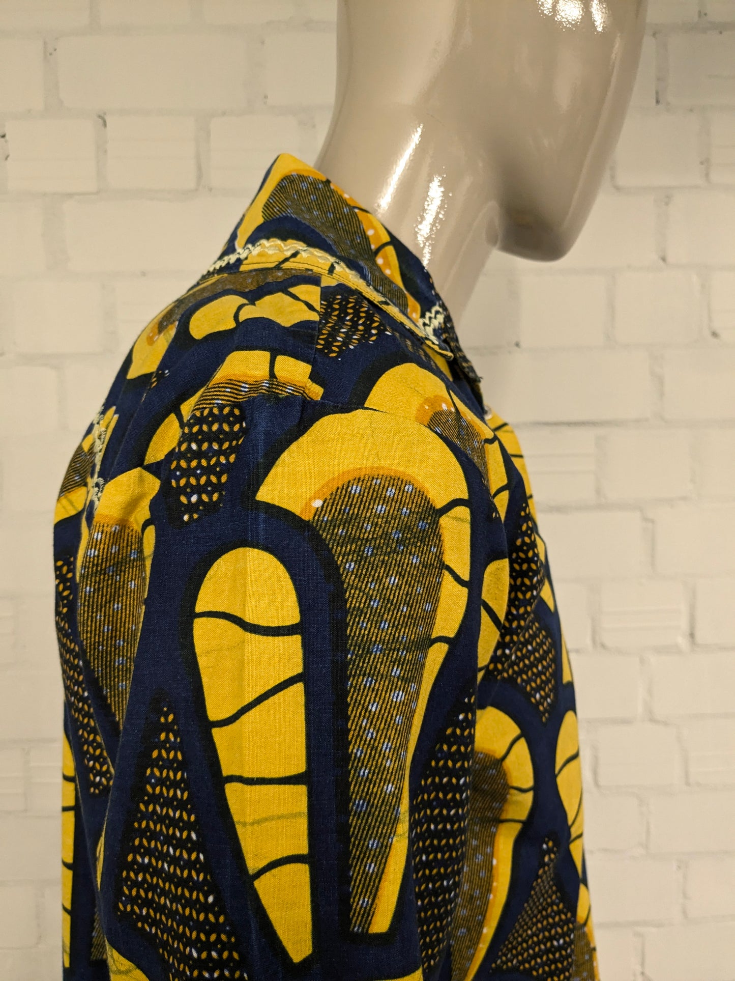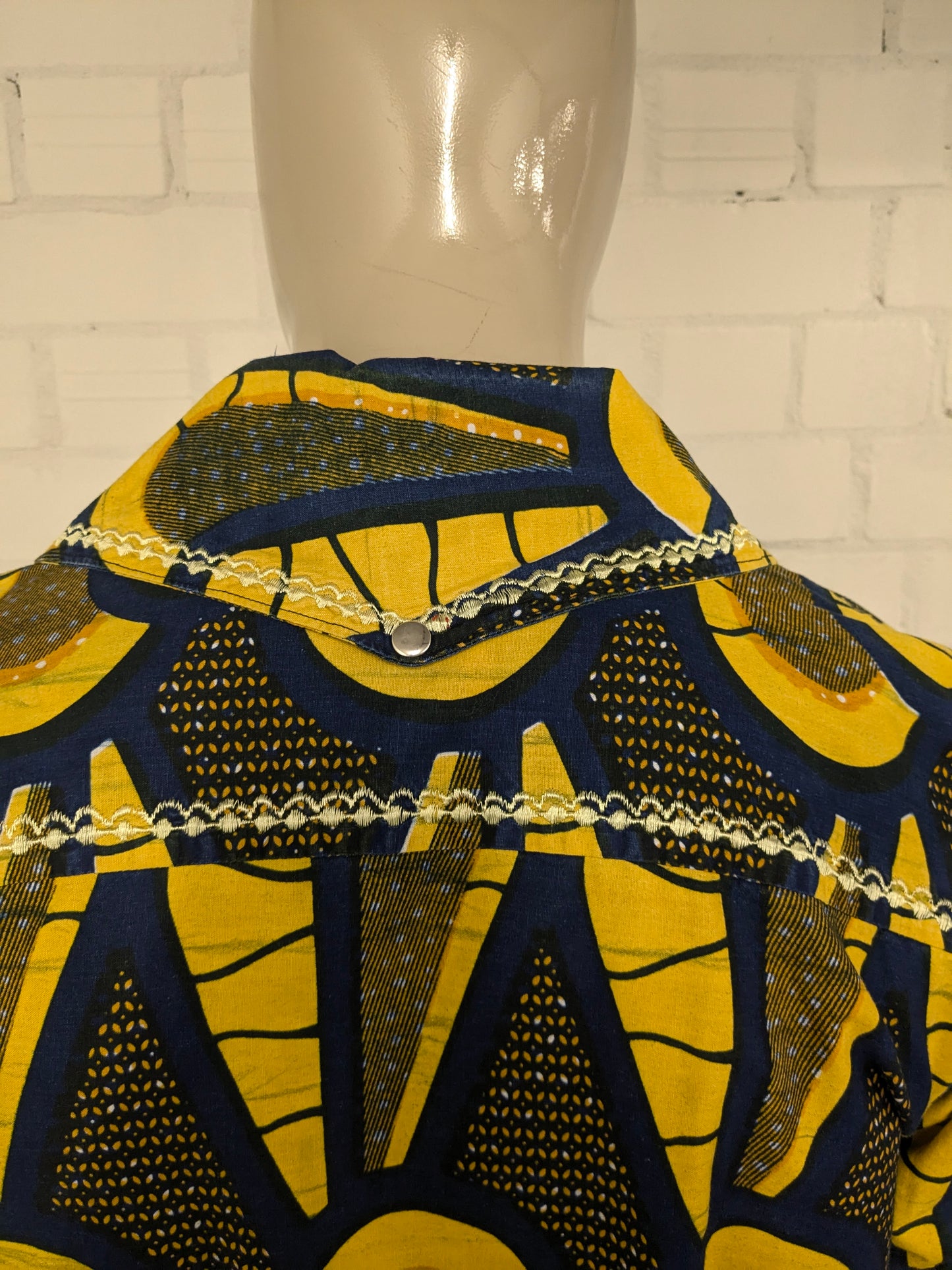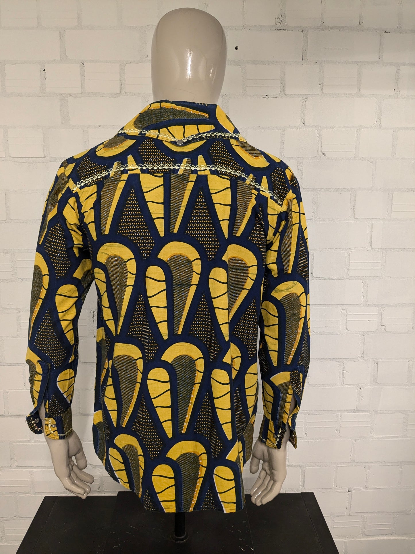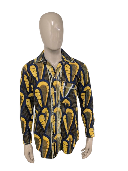 Camisa sin marca con pernos de prensa. Impresión africana azul amarillo. Tamaño M.