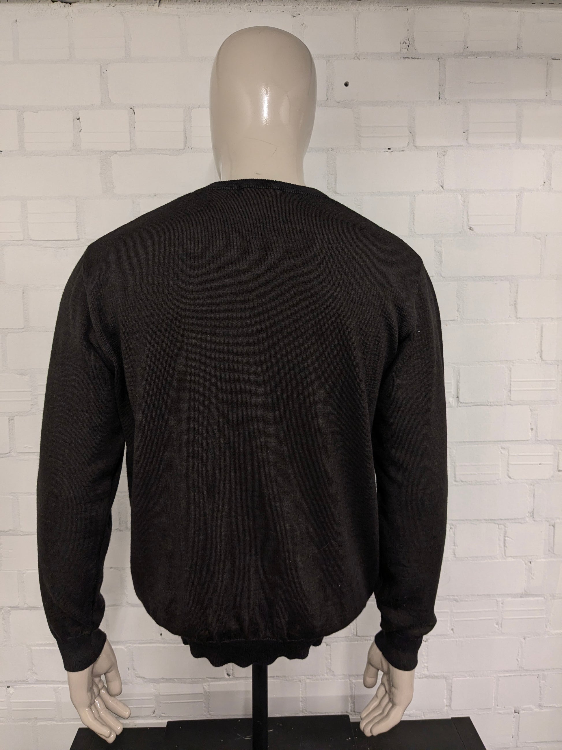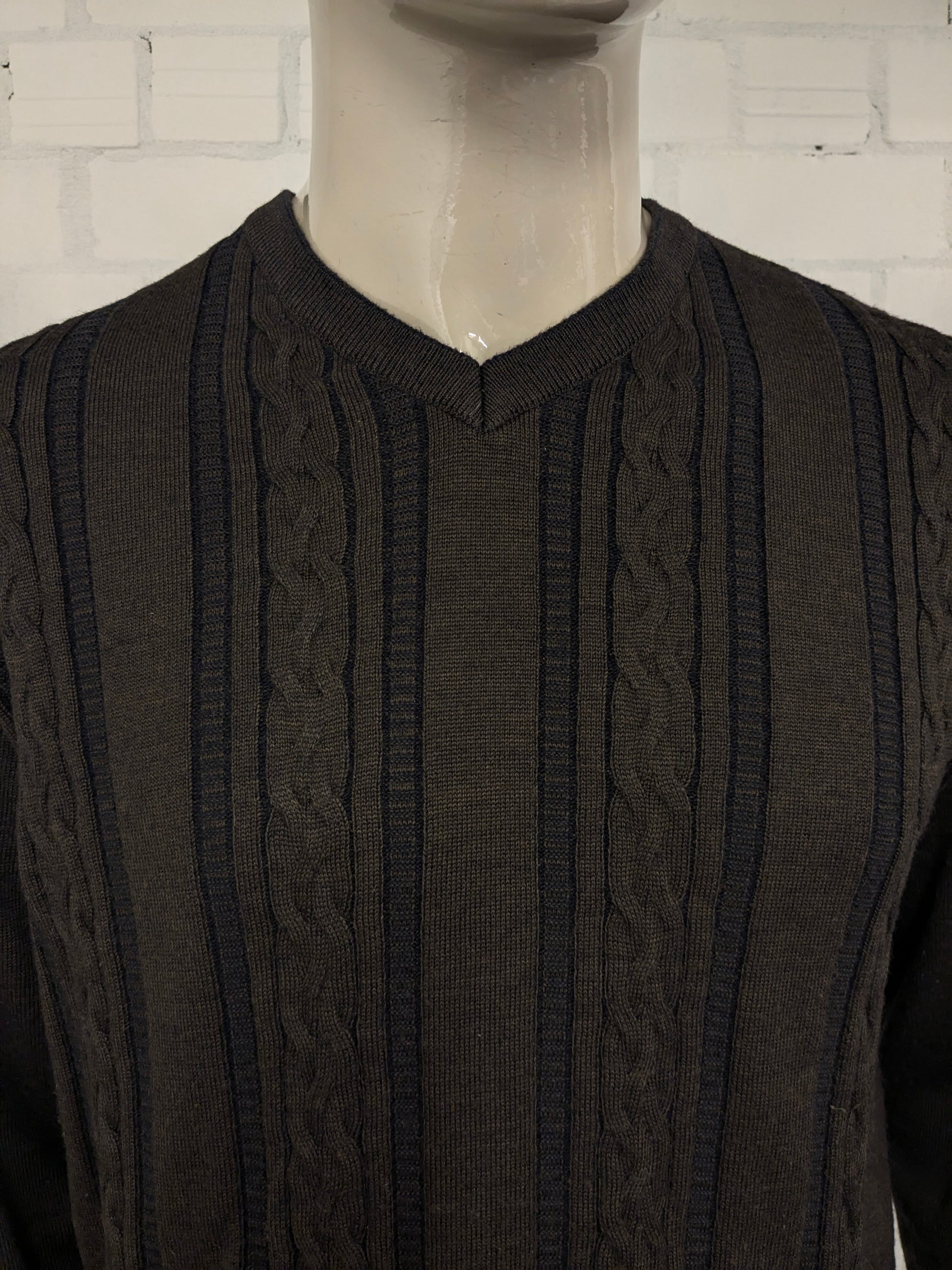 Pull Bartlett & Walker en laine mérinos avec col en V. De couleur marron bleu foncé. Taille L. 34% Laine.