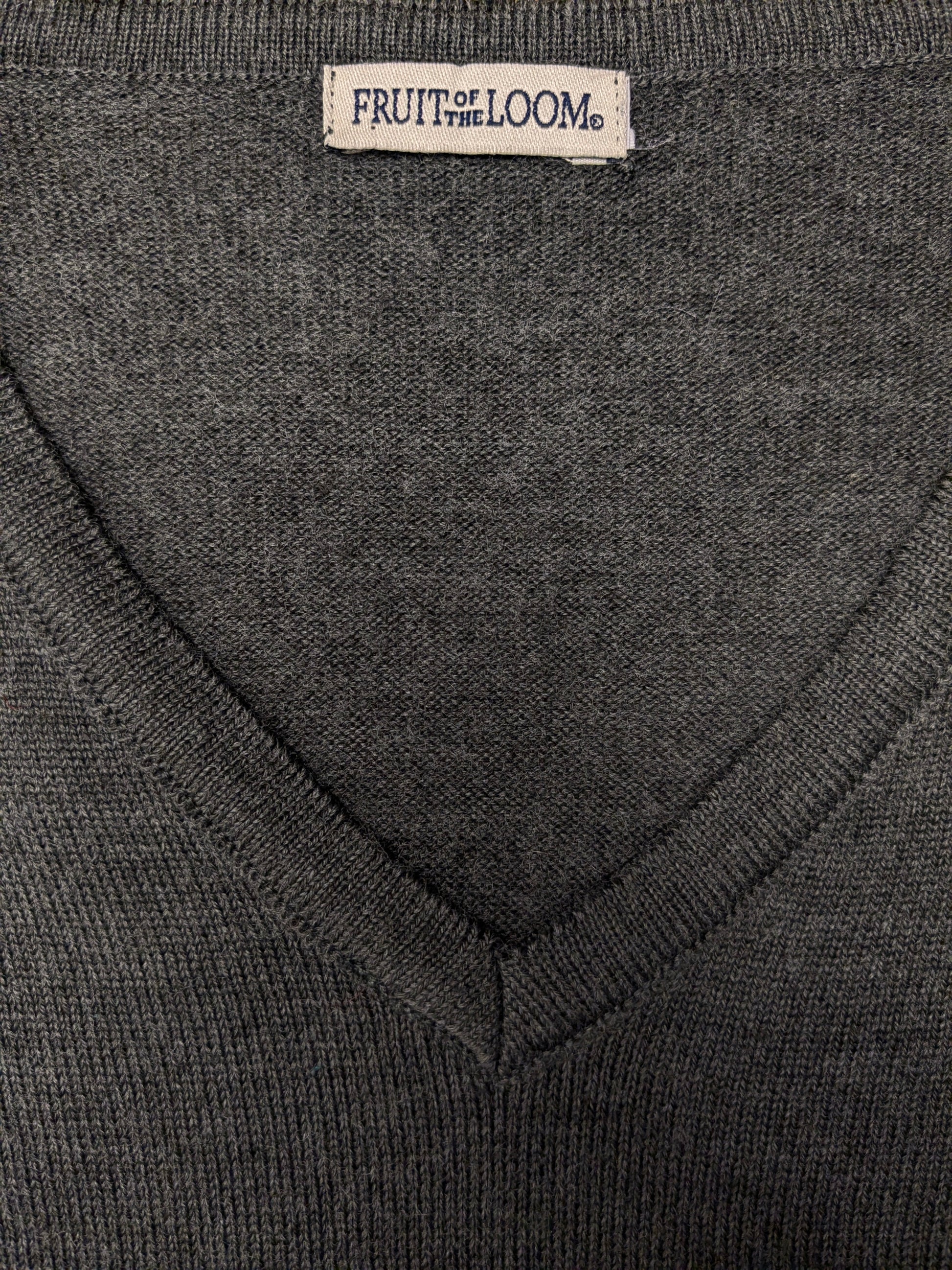 Pull en laine mérinos Fruit of the Loom avec col en V. Gris foncé mélangé. Taille XL. 60% Laine.