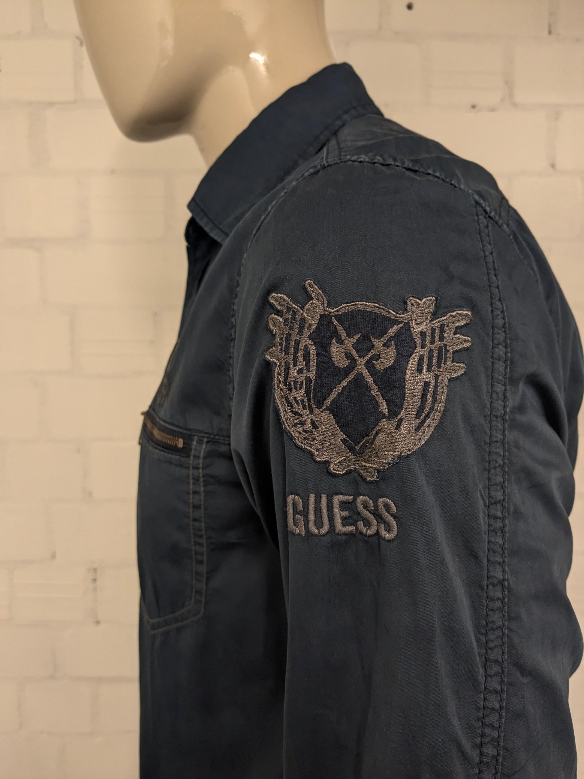 Devinez la chemise en jeans. Bleu foncé coloré avec des accents à fermeture éclair avec des sacs à poitrine. Taille L.