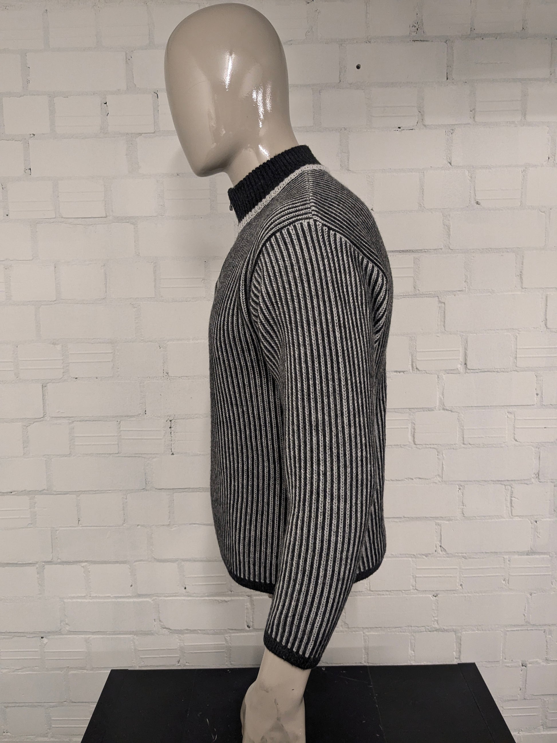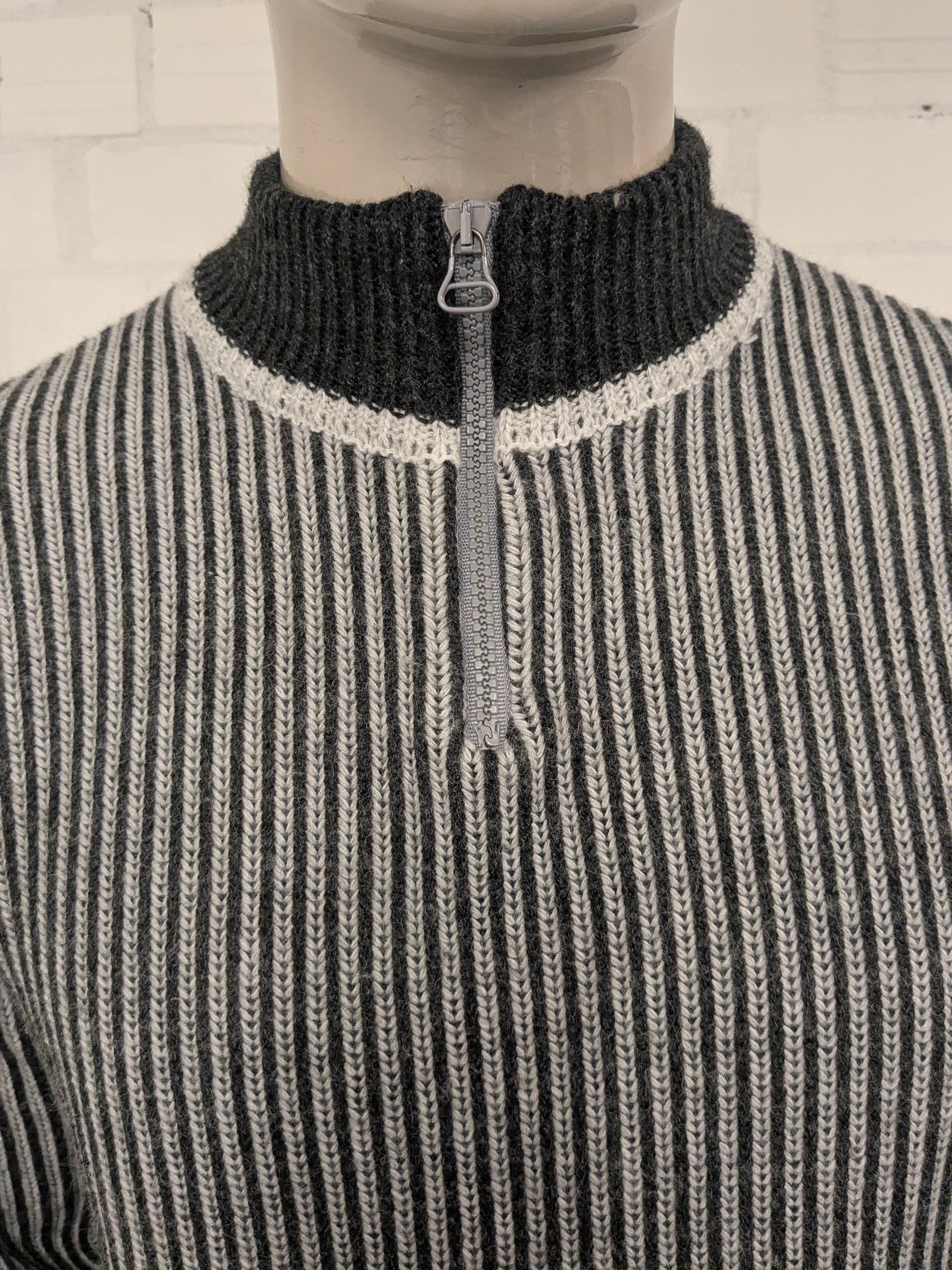 Pull en laine d'araignée vintage avec fermeture éclair. Gris blanc rayé. Taille M. 50% de laine.