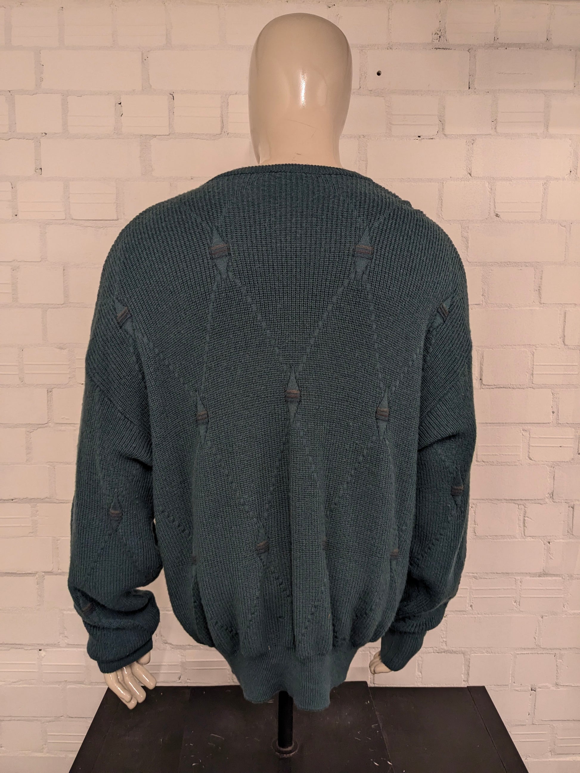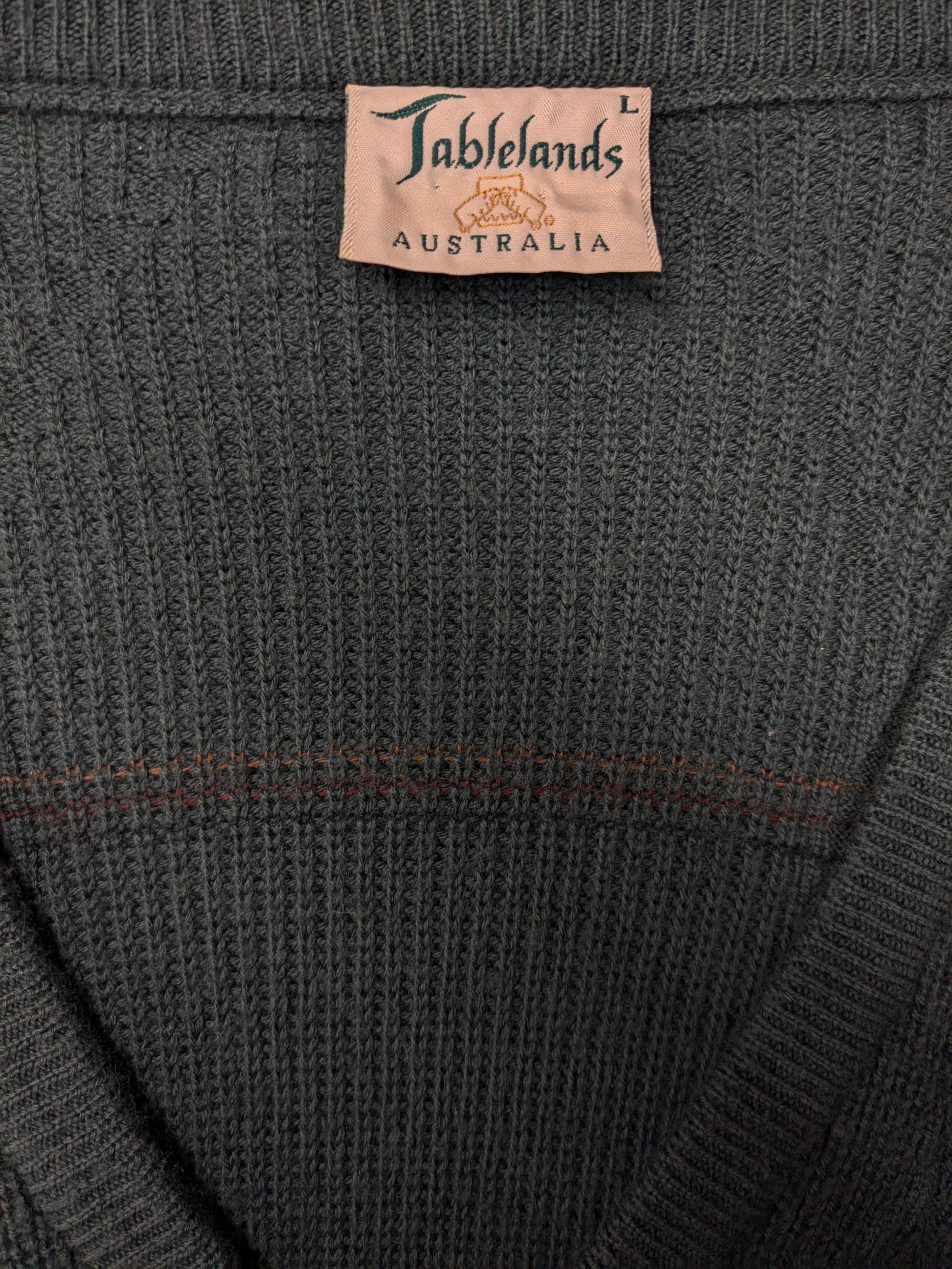 pull vintage Tablelands 100% Merino Wool avec col en V. Coloré en vert. Taille 3XL/XXXL.