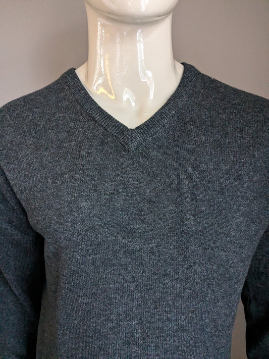 Pull en laine callaway avec col en V. Gris foncé mélangé. Taille S.