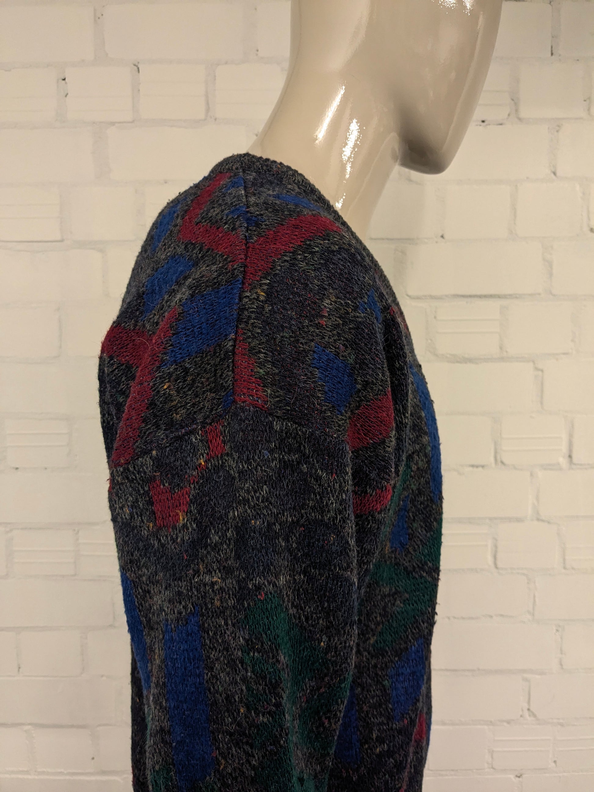 pull vintage en laine d’alpaga avec col en V. Couleur gris rouge bleu vert. Taille L. 25% Laine et 10% Laine Alpaga.
