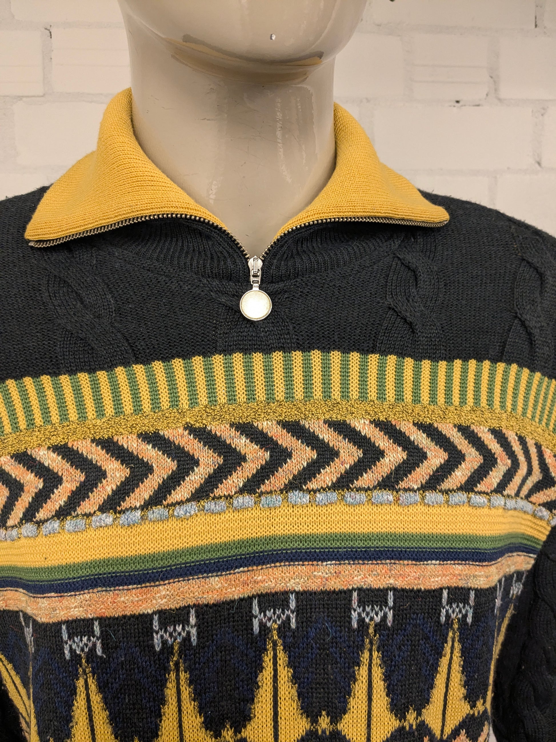 Pull en laine vintage avec fermeture éclair. Couleur jaune vert gris. Taille XL. 53% Laine.