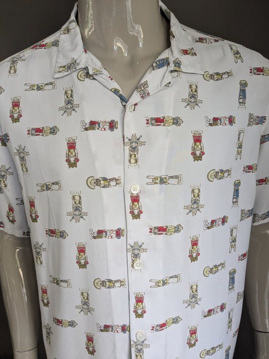 Camicia a stampa vintage manica corta. Stampa blu grigio beige. Taglia XL.