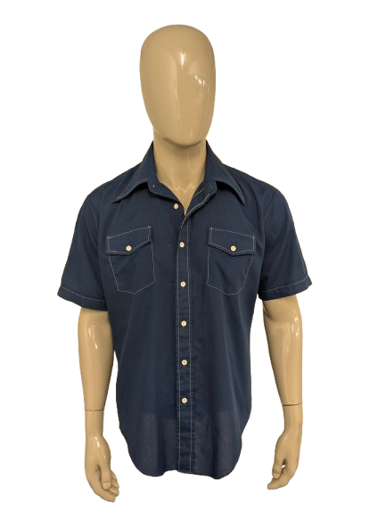 Sleeve corta della camicia degli anni '70 vintage con colletto punti. Blu con cuciture bianche. Taglia XL.