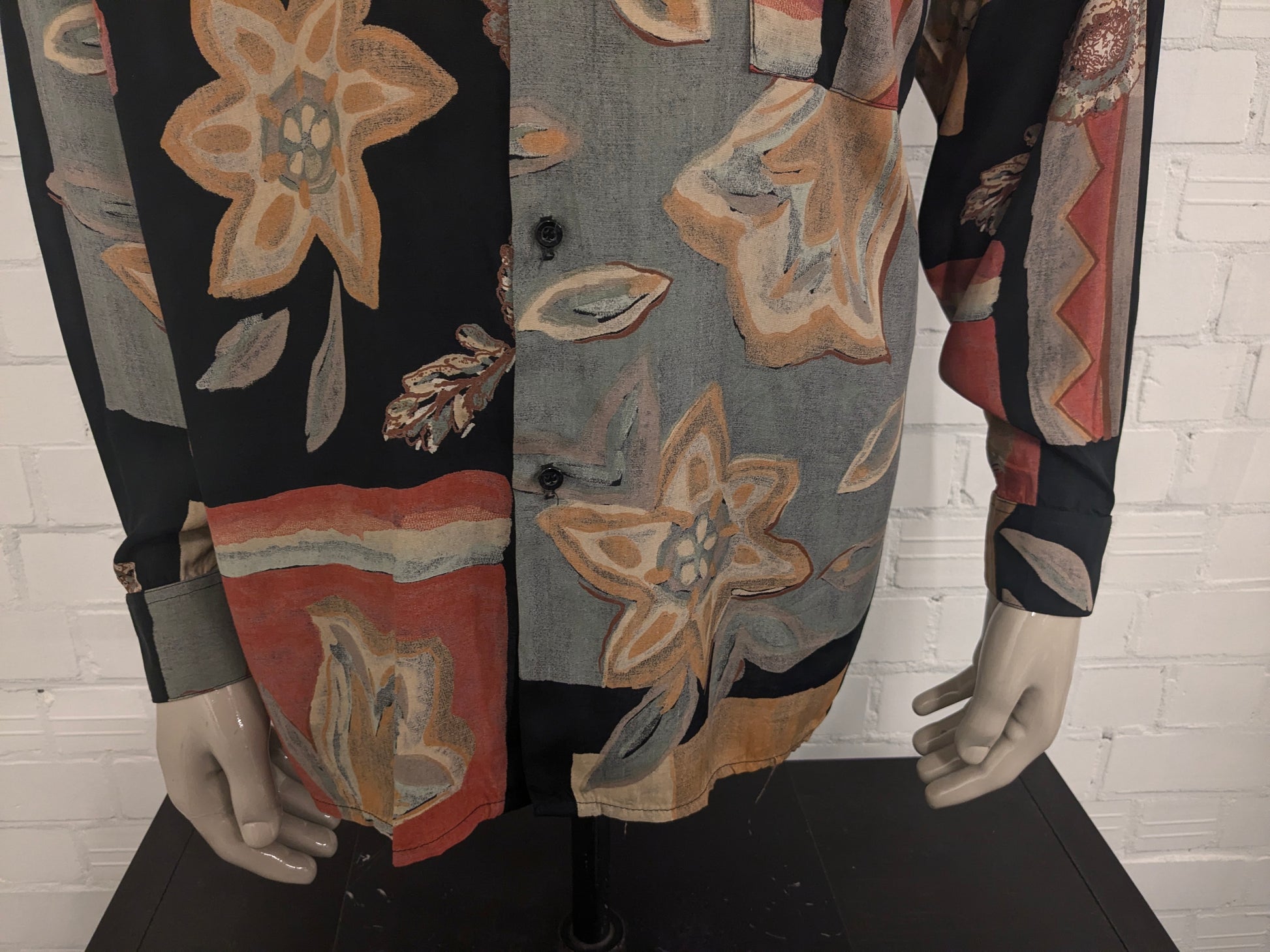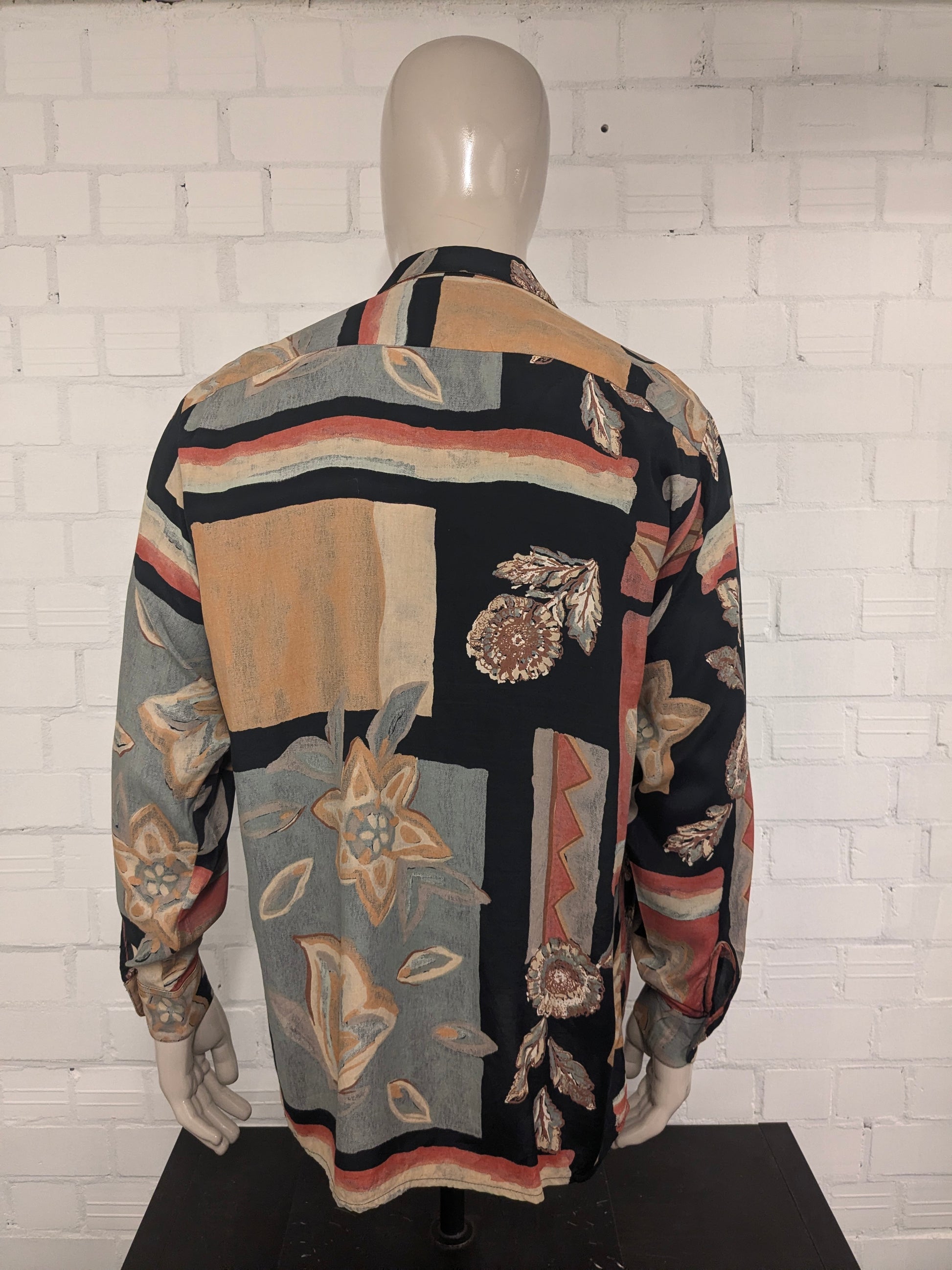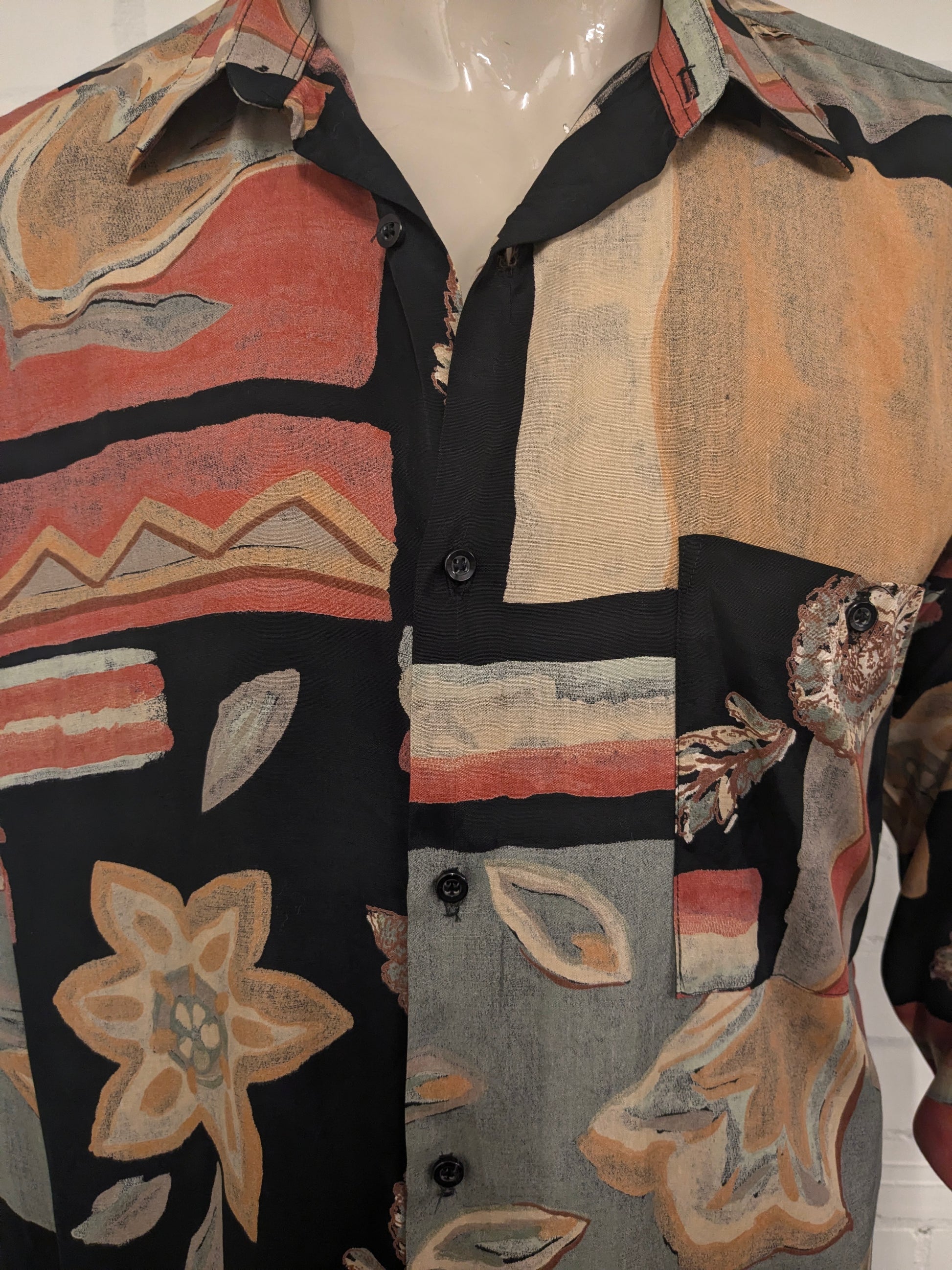 Vintage Black Dolphin 80'x / 90's overhemd. Zwart Oranje Rode print. Maat XL.