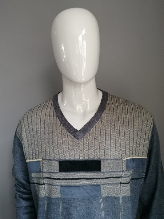 Maglione vintage massimo dati con scollo a V. Colorato blu grigio. Dimensione L. (35% lana)